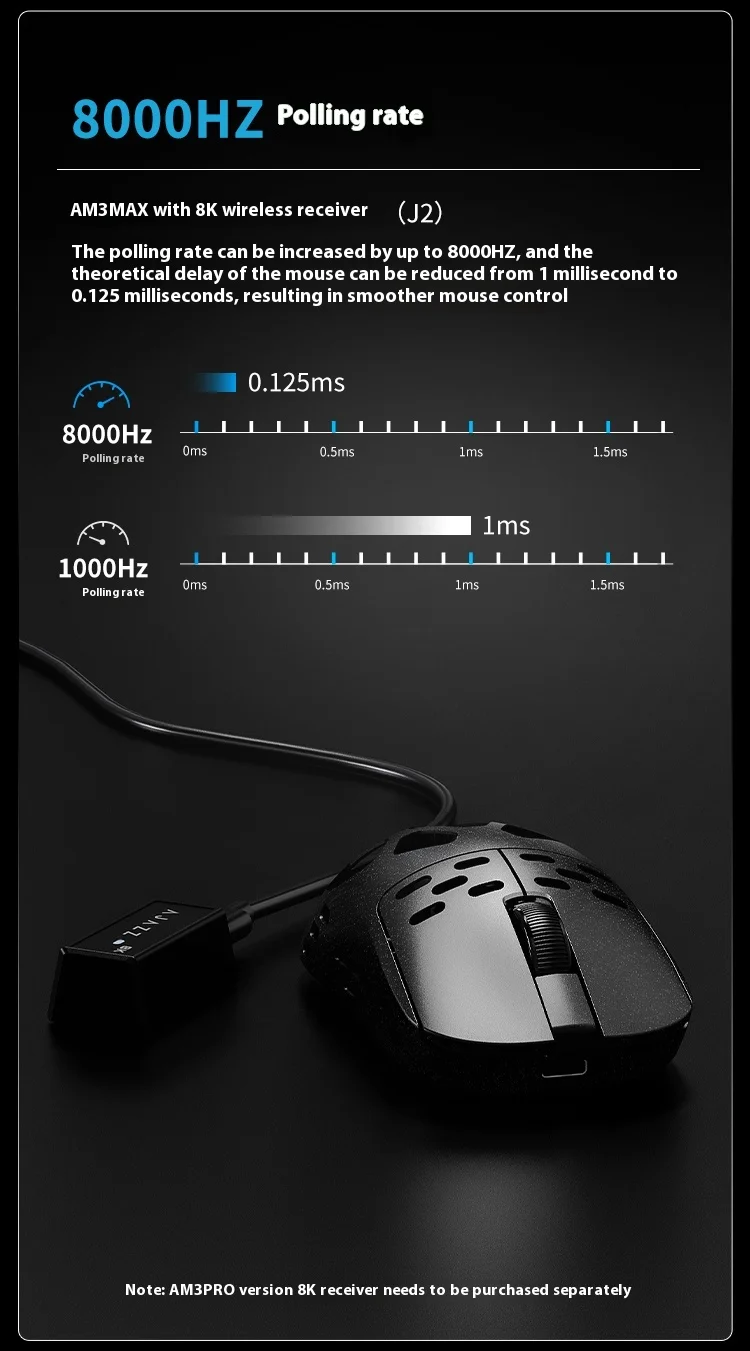 Driver software, adjustable 2.4G report rate: 125Hz/250Hz/500Hz/1000Hz/2000Hz/4000Hz/8000HZ