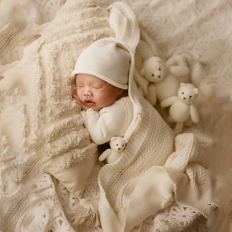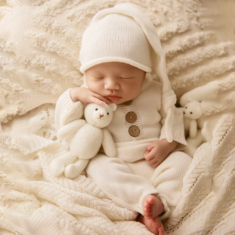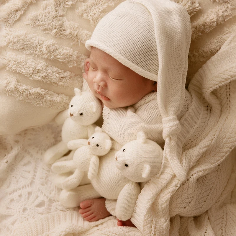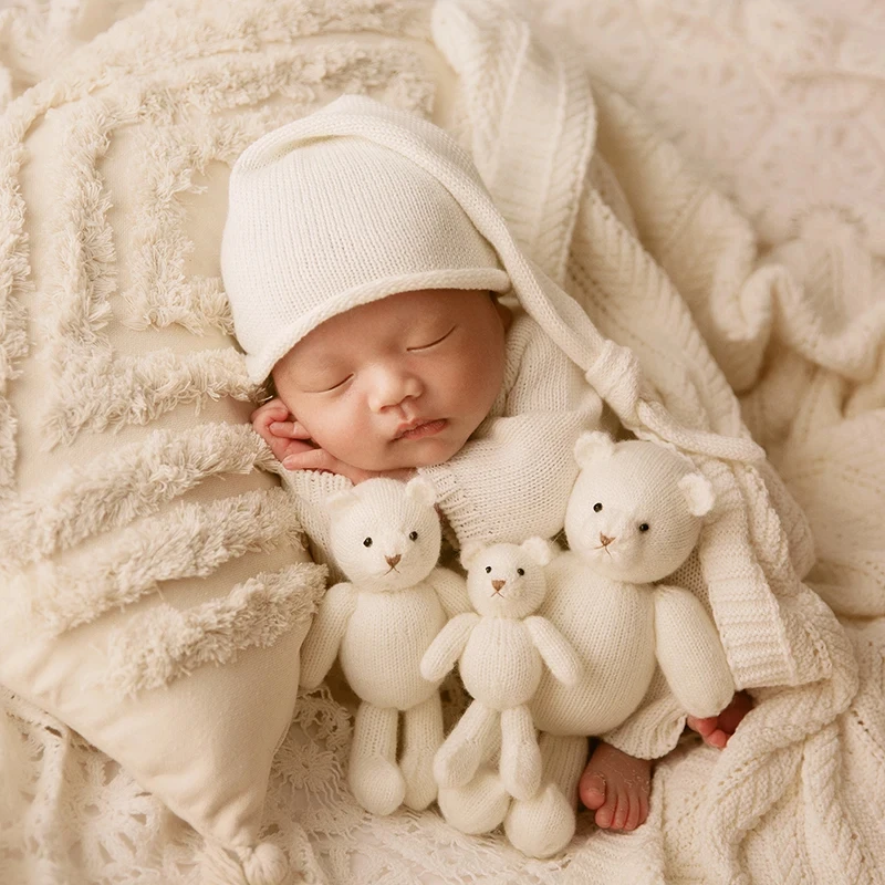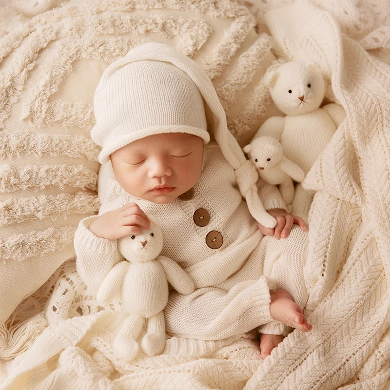 0-1 Month Baby Photography Outfit Simple Style Infant Jumpsuit + Hat 2pcs/Set Crocheted Bear Dolls Newborn Photo Accessories