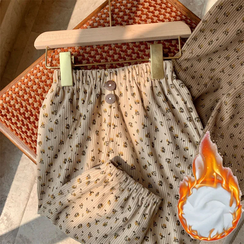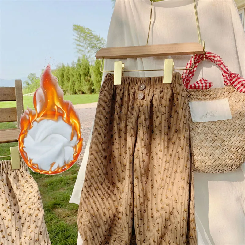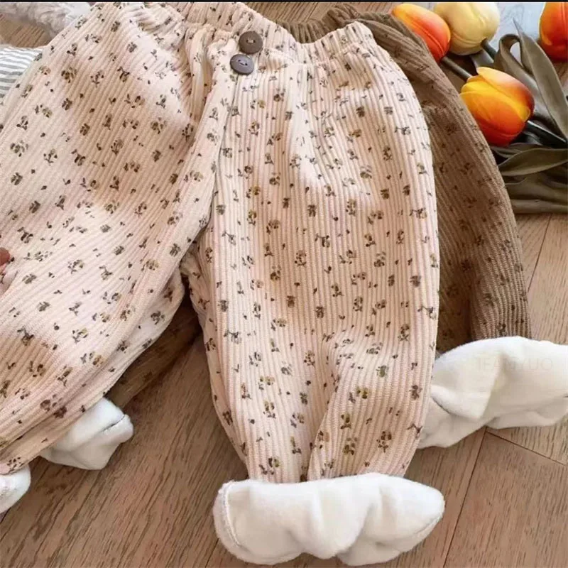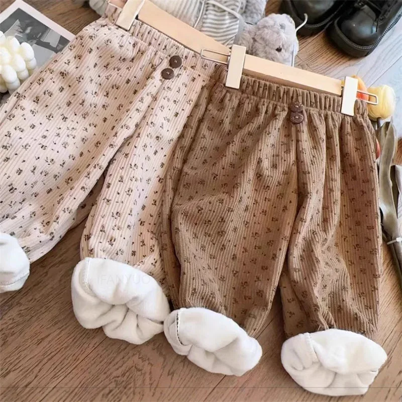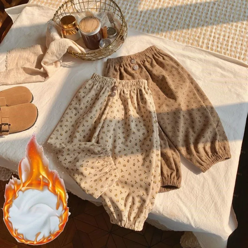 0-12Y Children Thicken Plush Korean Lantern Pants Spring Autumn Fashion Girls Floral Casual Pants Winter Warm Boys Baby Trousers