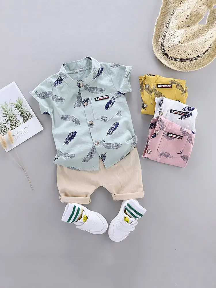 0-3 year old baby summer feather printed shirt short sleeved shorts set with fashionable cartoon random printing 2-piece set wit