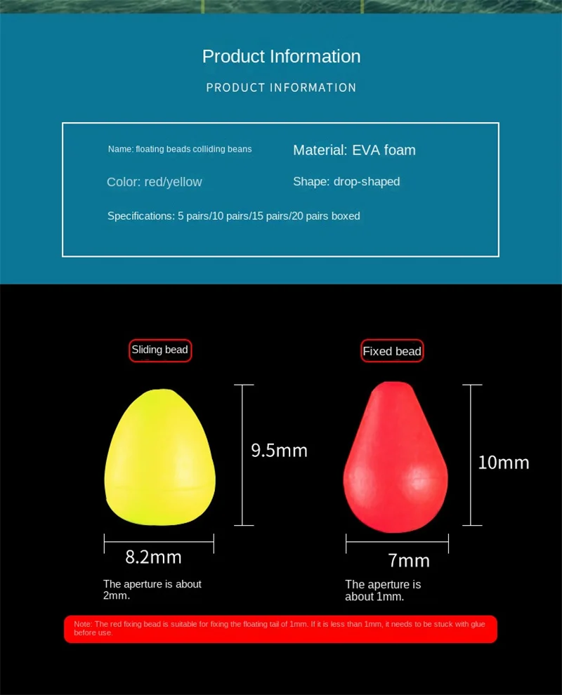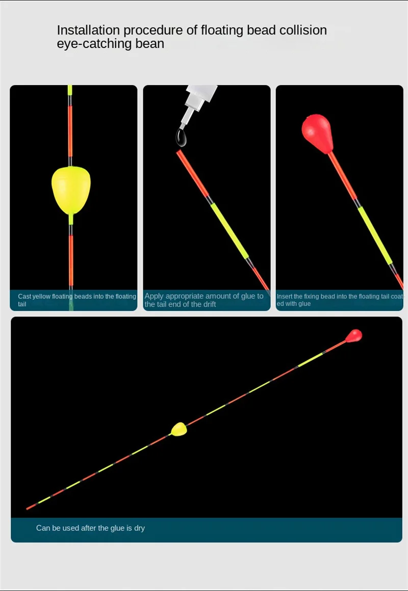 3. Installation steps of floating beads against eye-catching beans: apply appropriate amount of glue to the end of the floating tail, insert the fixing beads into the end of the floating tail, and insert the fixing beads into the floating tail coated with glue, which can be used after the glue