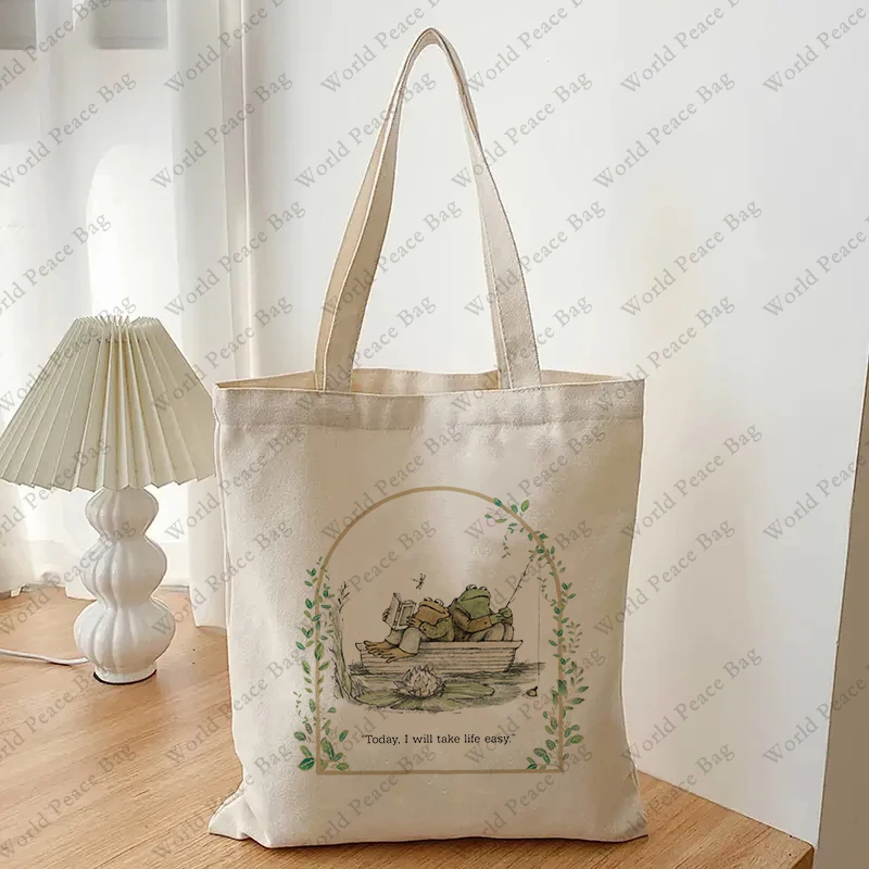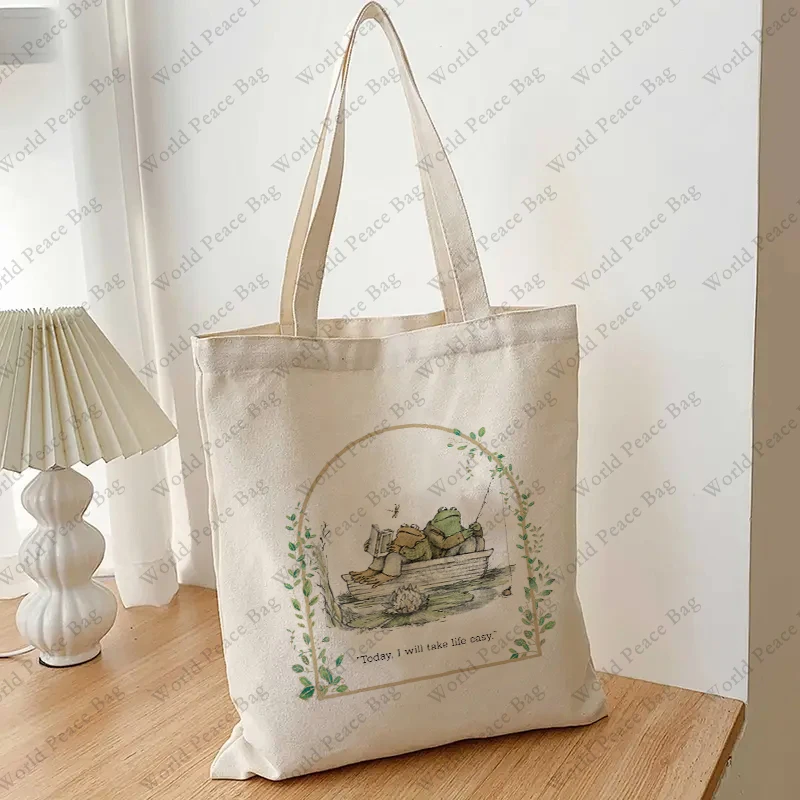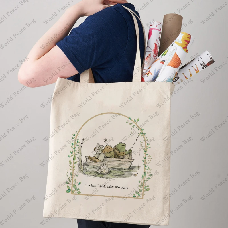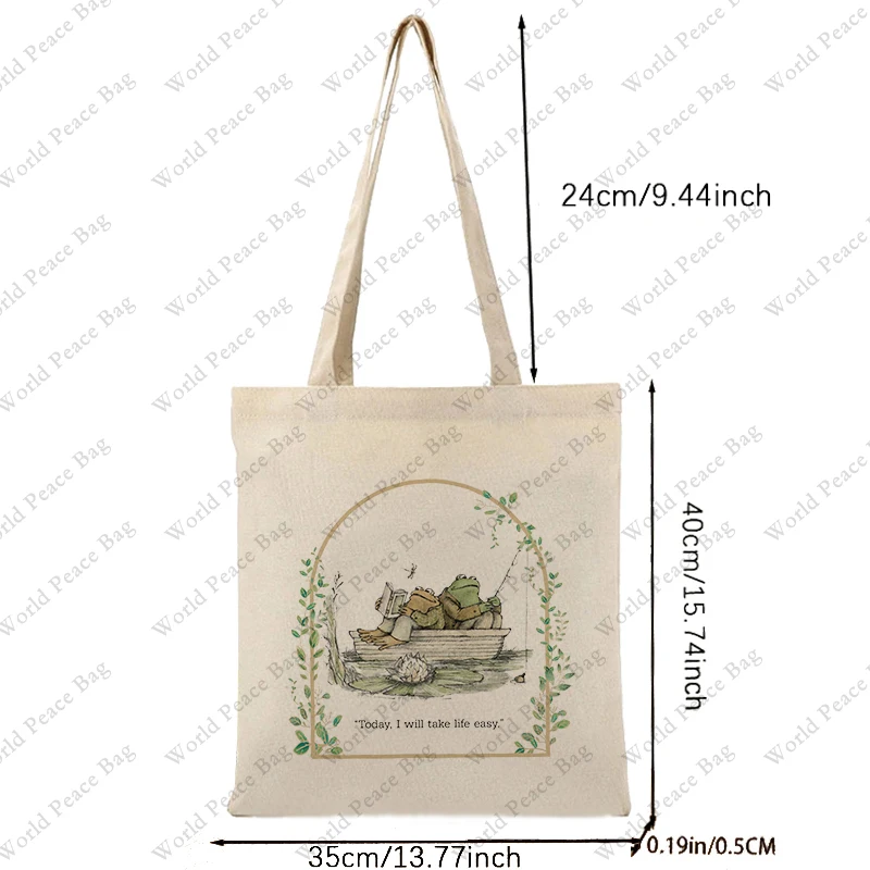 1 pc Vintage Classic Book Frog and Toad pattern Tote Bag Canvas Shoulder Bag For Travel Daily Commute Women’s Reusable Shopping