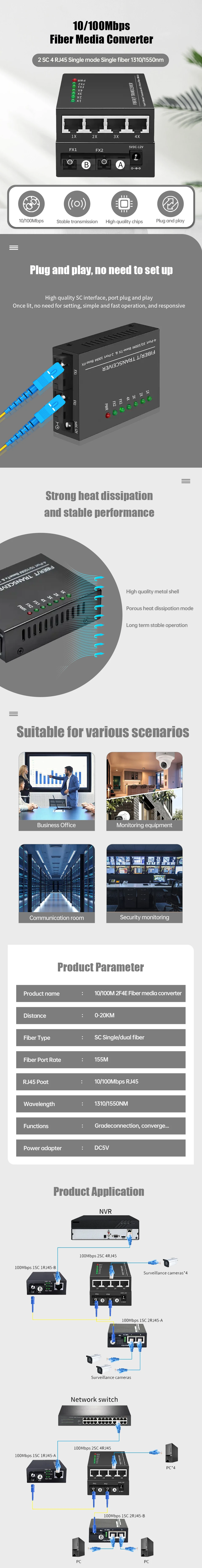1 Pcs 4 RJ45 2 SC fiber port fiber media Converter 1310nm/1550nm 20km Fiber Optical Media converter with power supply