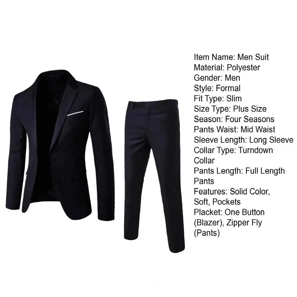 Gender: Men Style: Formal Fit Type: Slim Size Type: Plus Size Season: Four Seasons Pants Waist: Mid Waist Sleeve Length: Long Sleeve Collar Type: Turndown Collar Pants Length: Full Length Pants Features: Solid Color, Soft, Pockets Placket: One Button (Blazer), Zipper Fly (Pants)