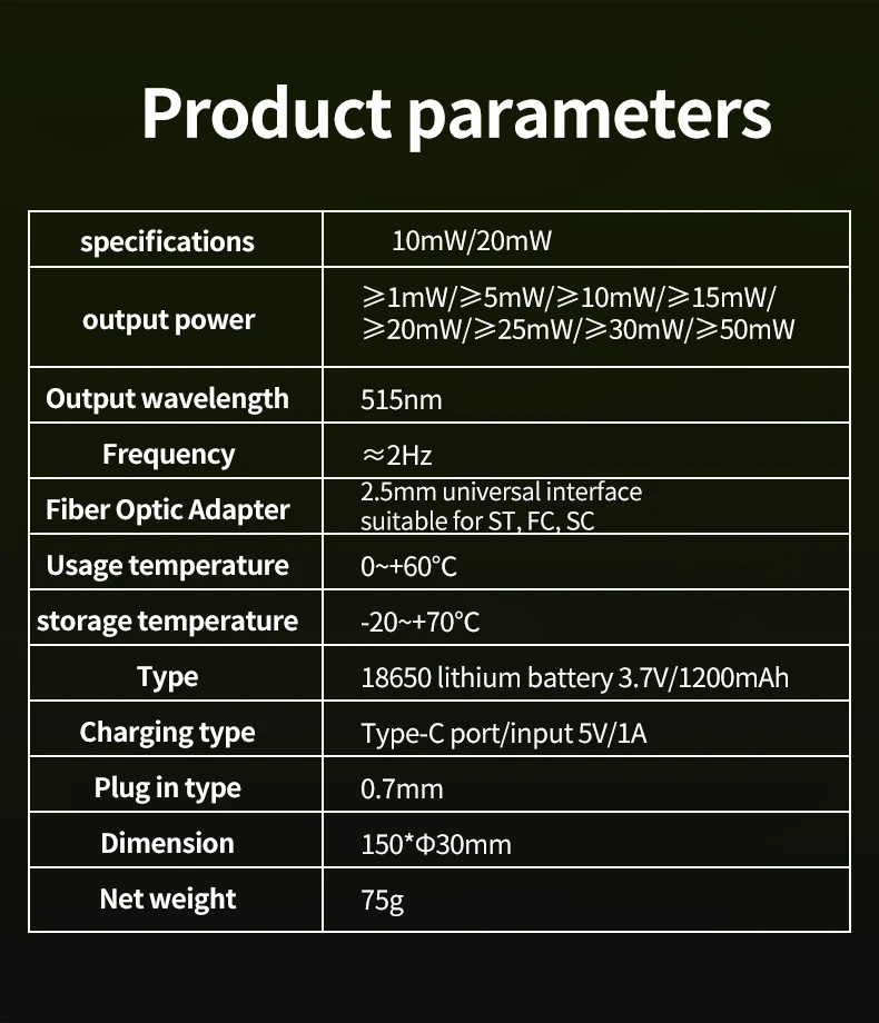 10-20MW Light VFL Visual Fault Locator,Recargable Green Laser Pen FTTH Fiber Optic Cable Test