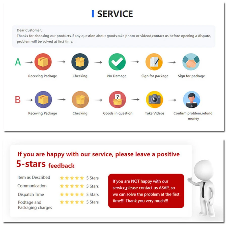 dear buyer, If you have any questions, please feel free to contact us. And we will reply in 24 hours except weekends. if you are not satisfied with our product and service please contact us before leaving negative feedback then we will try our best to solve problems and make you satisfied.