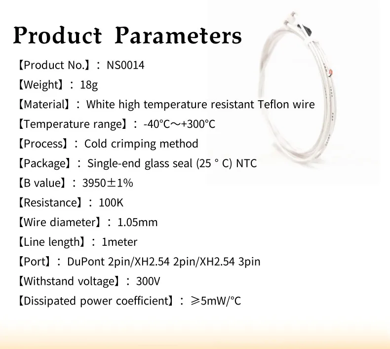 Product Name: Three-dimensional printing NTC single-ended glass-sealed thermistor temperature sensor terminal 100K 1% 3950 300 degrees