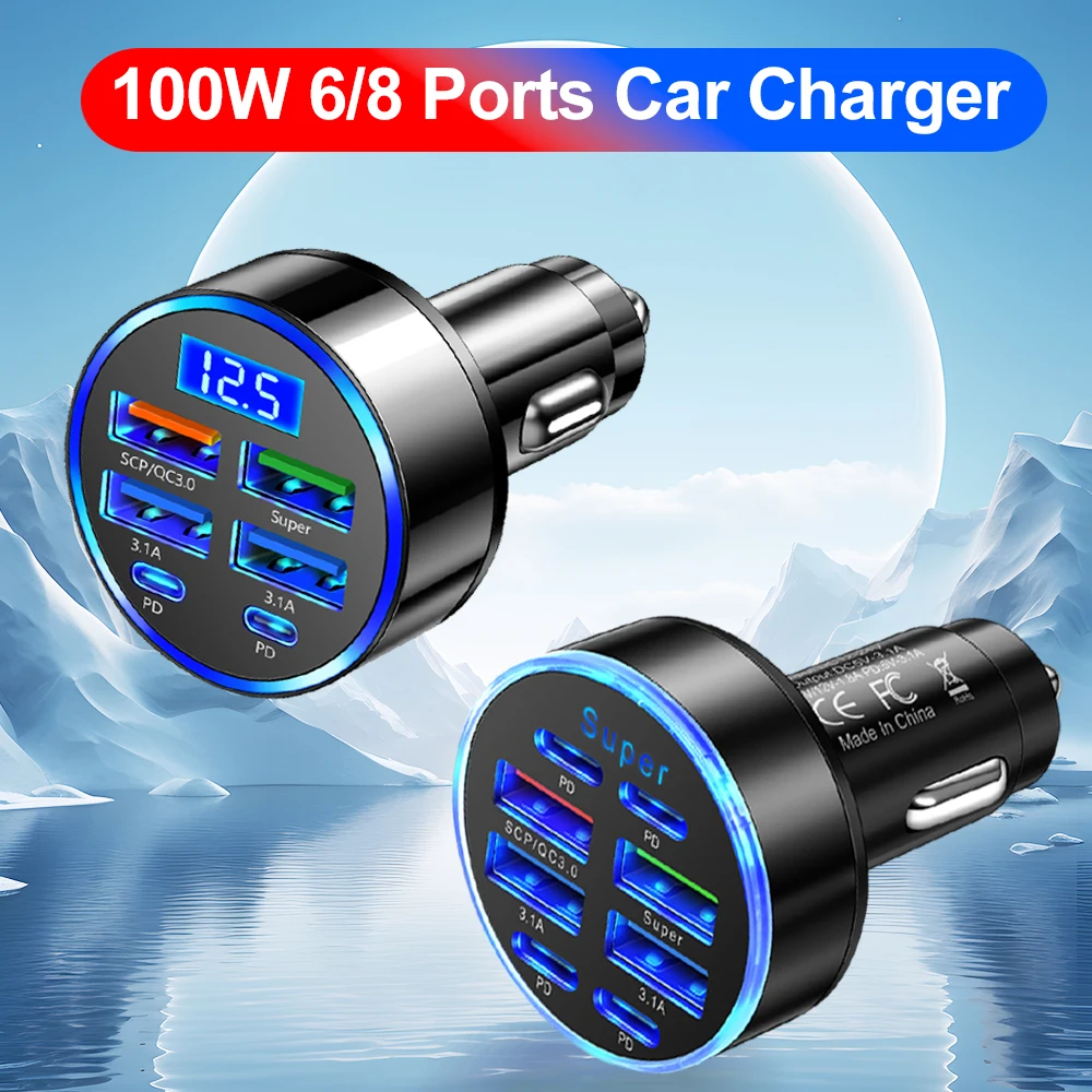 100W 6/8 Ports Car Charger Fast Charging PD QC3.0 USB C Car Phone Charger Type C Adapter in Car For iPhone Samsung Huawei Xiaomi