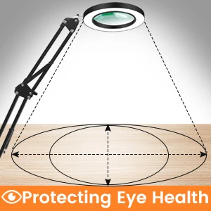The glass lens can be adjusted 270° up and down, and 360° whirl. 4 strong spring and 3 knots on the arm can firmly support the magnifying lamp.