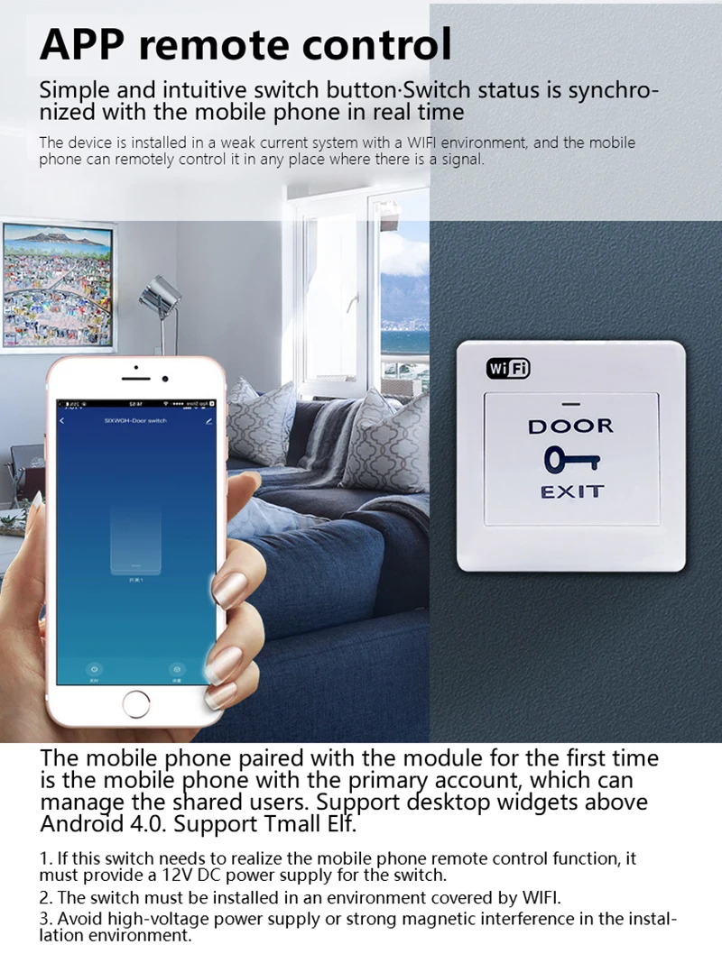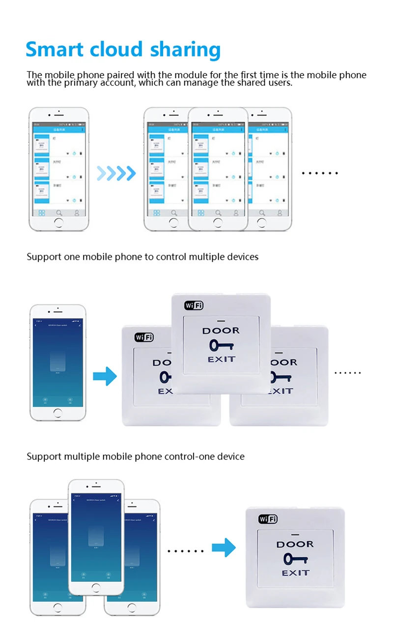 The mobile phone paired with the module the first time is the mobile phone with the primary account, which can manage the shared users. Support mobile phone to control devices, support mobile phones to control device.