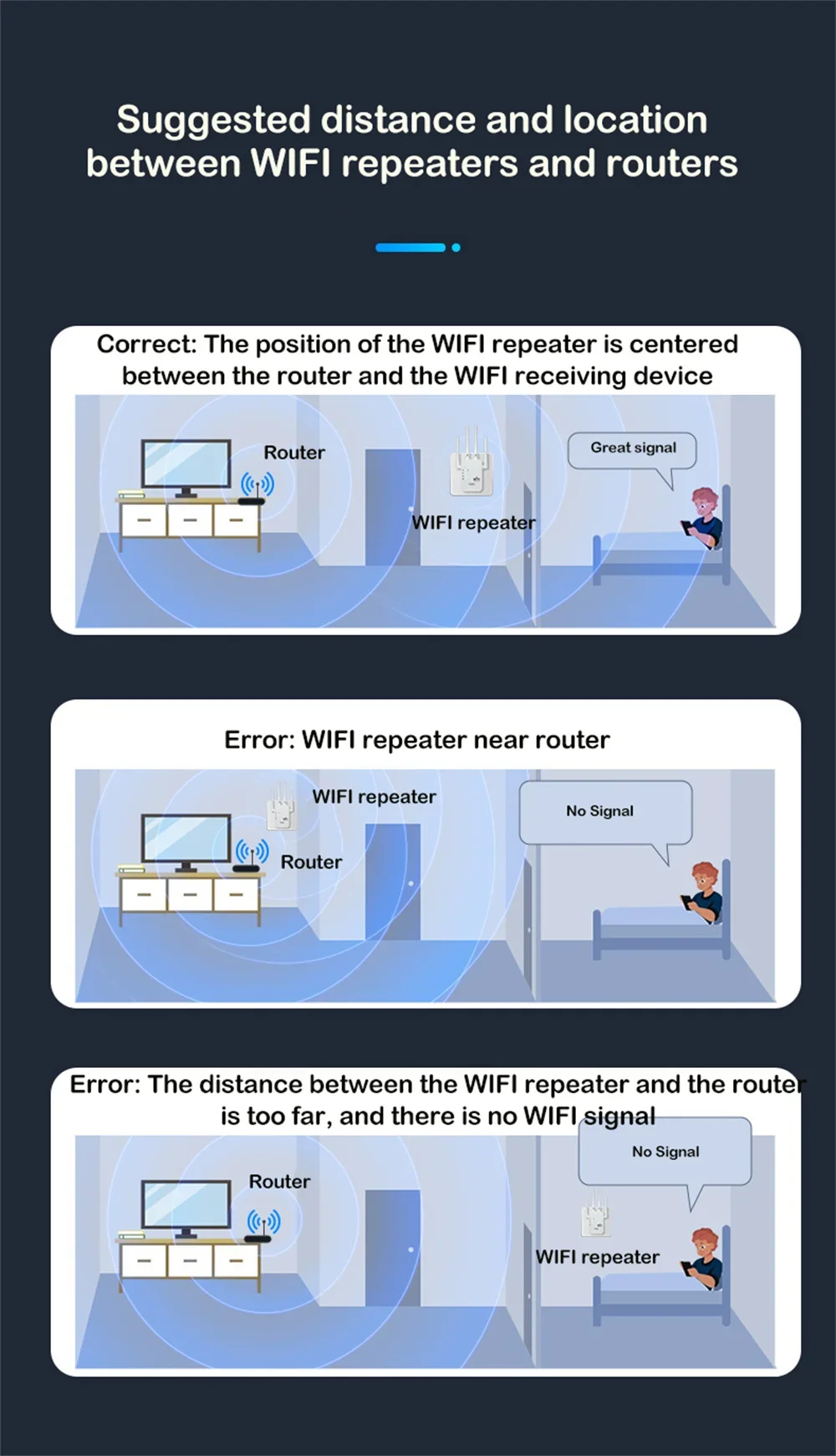 2.Adjustable 4 High Gain external Antenna,can 180° rotating. 360 Degree full signal coverage ,extending the signal to cover every corner of your house.All the blind side in house with weak Wi-Fi coverage will be eliminated!