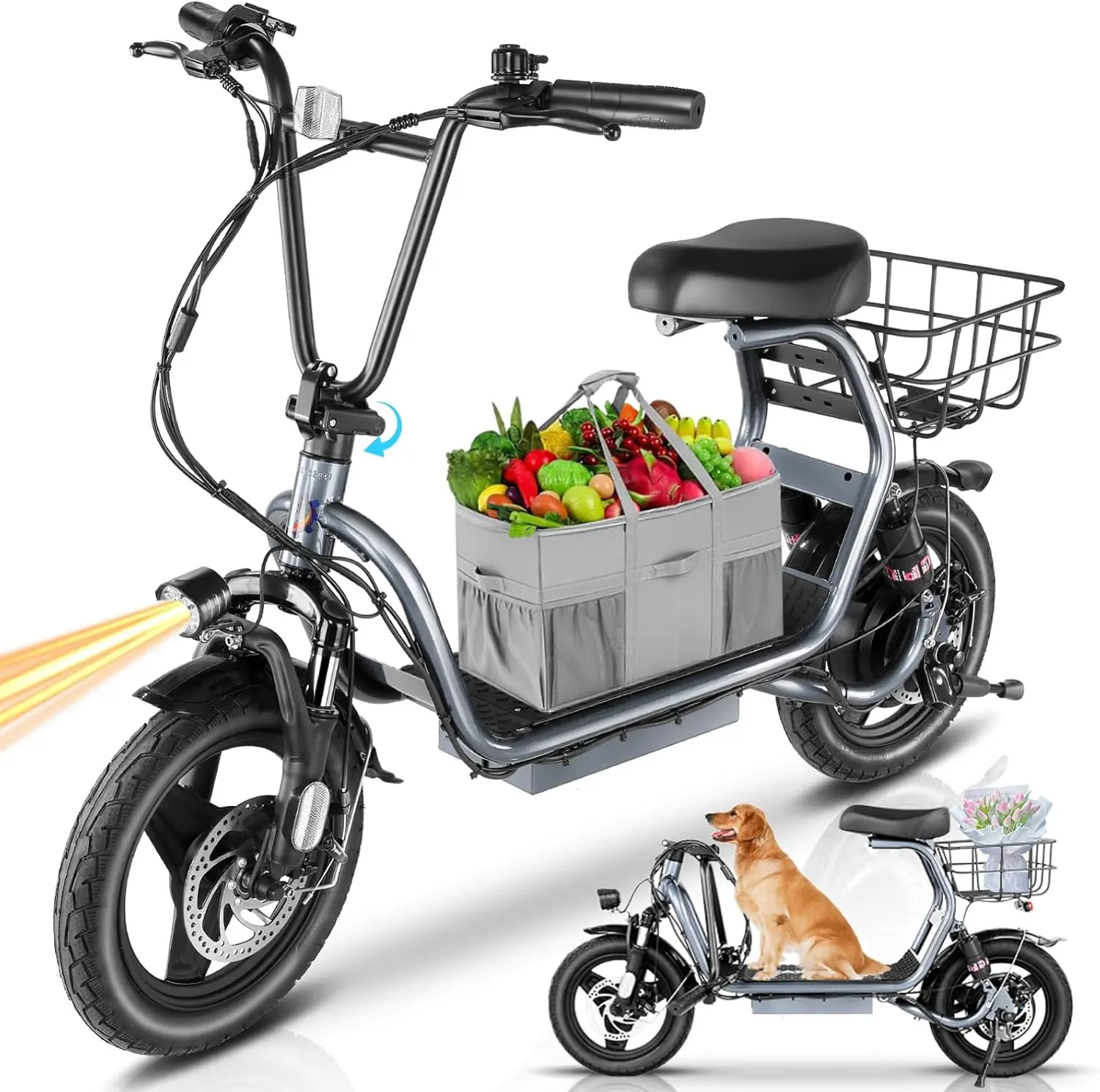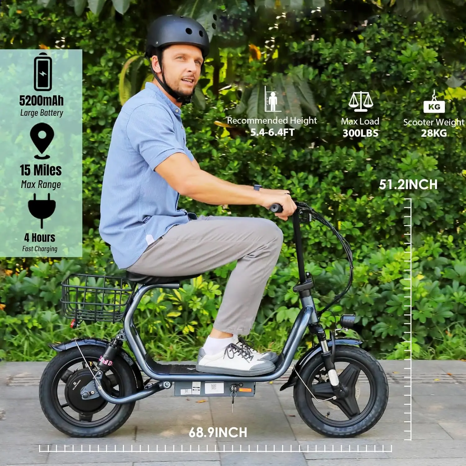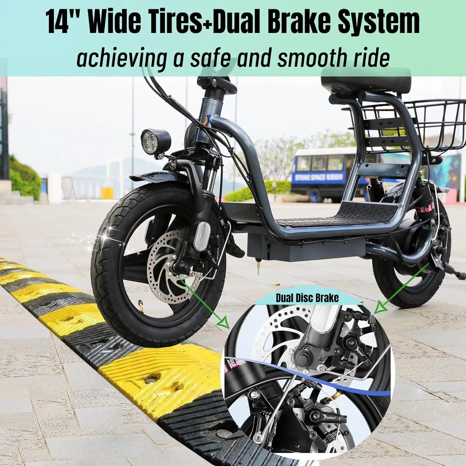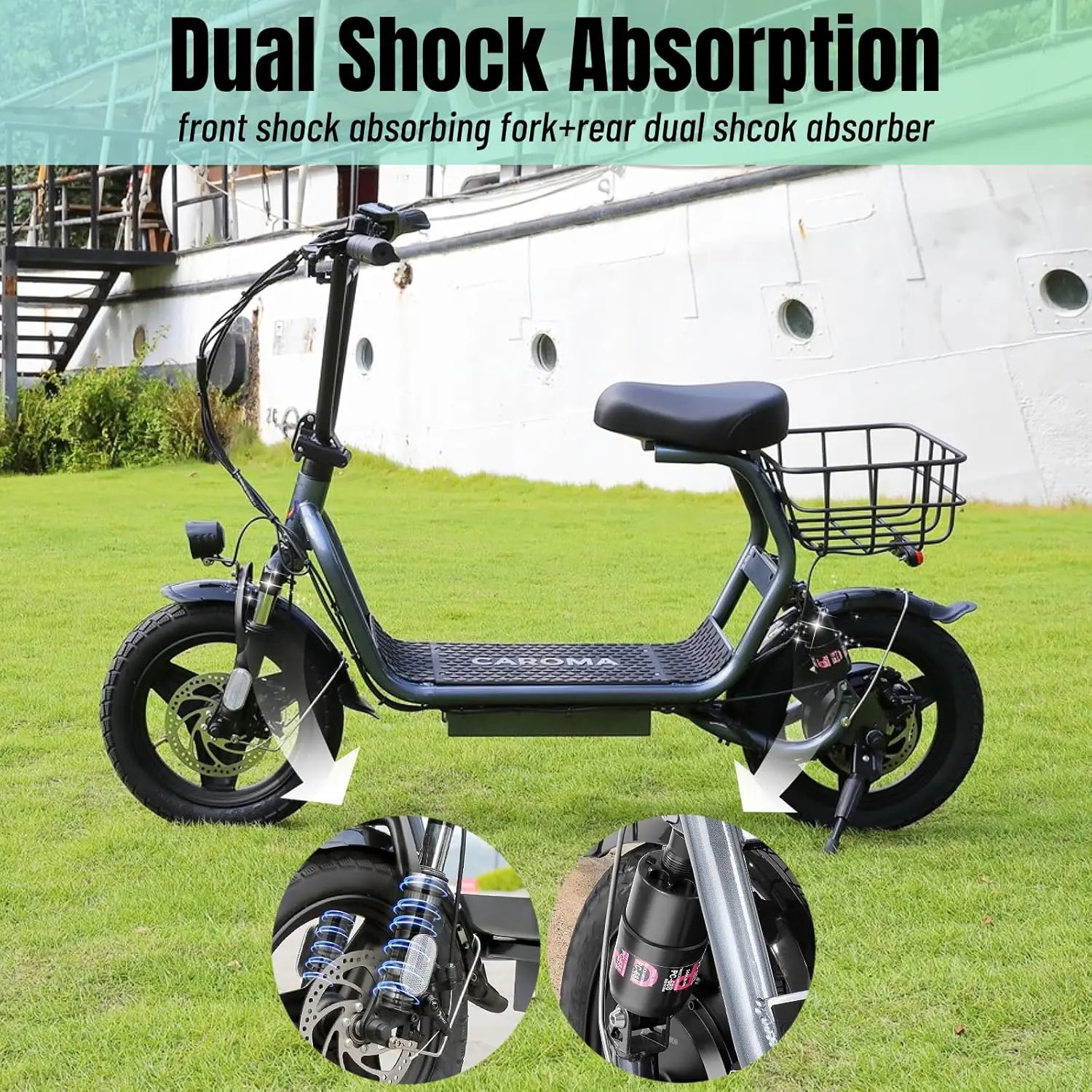 - PORTABILITY & DURABILITY: Foldable design makes this electric scooter easy to store and carry. The metal body combined with 14-inch tires is sturdy and durable. Maximum load 300 lbs. The premium suspension fork combined with dual shock absorbers at the rear wheel help dampen vibrations, allowing you to enjoy a super smooth ride.