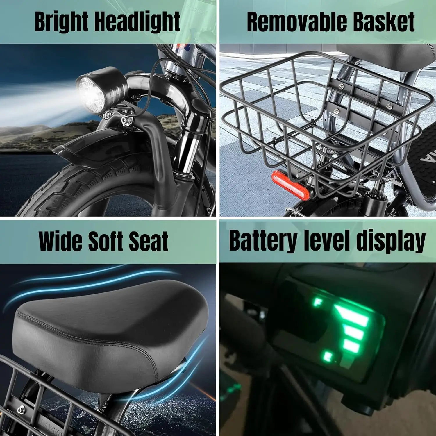 electric scooter for adults has bright front and rear lights as well as brake tail lights to protect your night driving. Electrical safety system that automatically cuts off power when braking. Equipped with a super soft and wide shock-absorbing seat and a removable basket to provide you with a safe and comfortable trip. - LCD DISPLAY & EASY ACCELERATION: The triangular handlebar is more stable, and the lcd display can clearly shows the battery level, giving you a sense of security when you ride. You can accelerate by gently twisting the right handlebar, which is easy to operate.