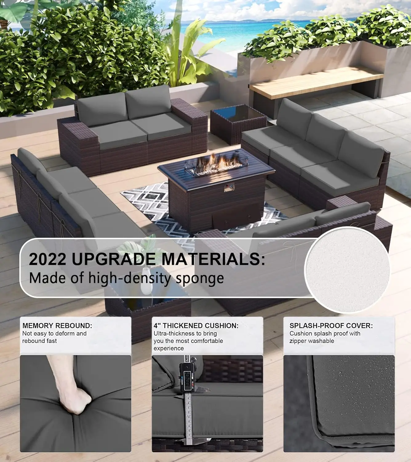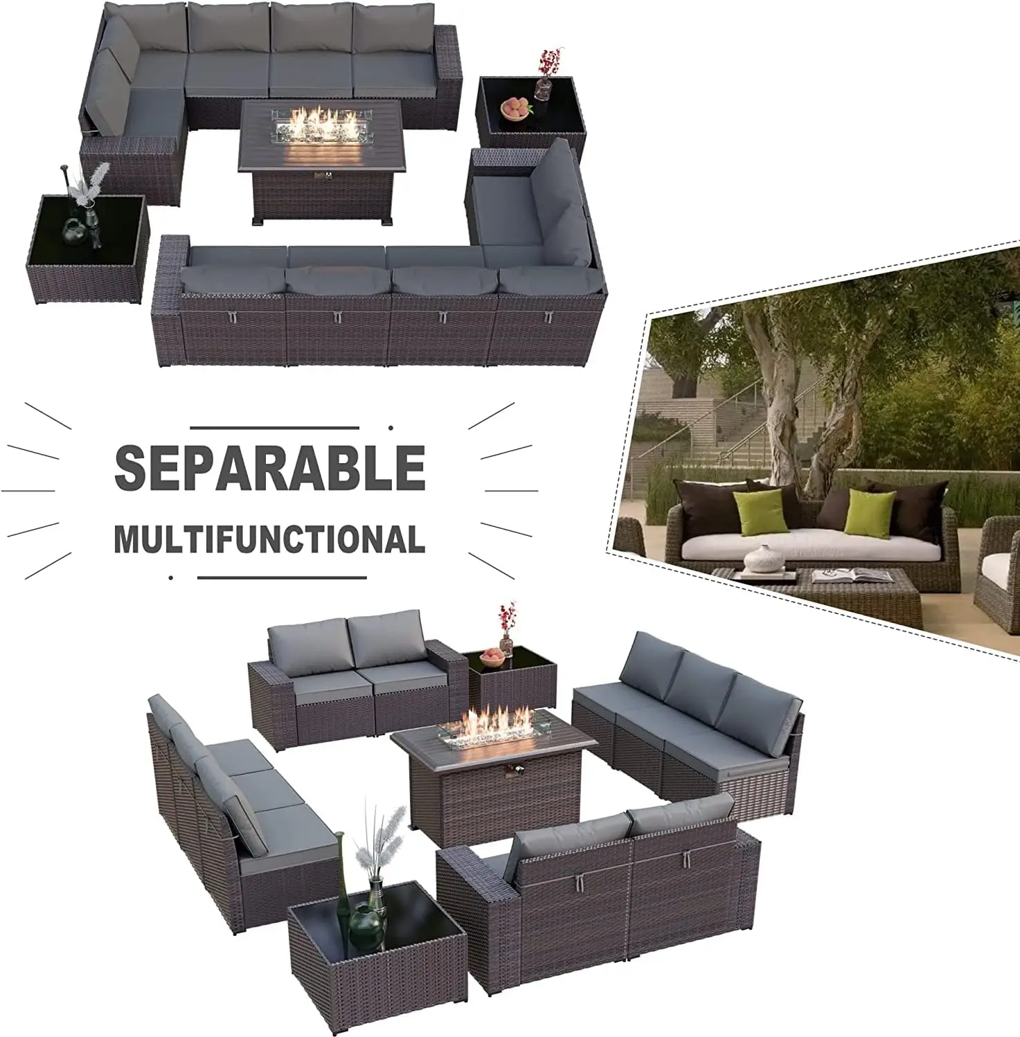 13 Piece Outdoor Patio Furniture Set with 43″ 55000BTU Gas Propane Fire Pit Table Wicker rattan terrace sectional sofa