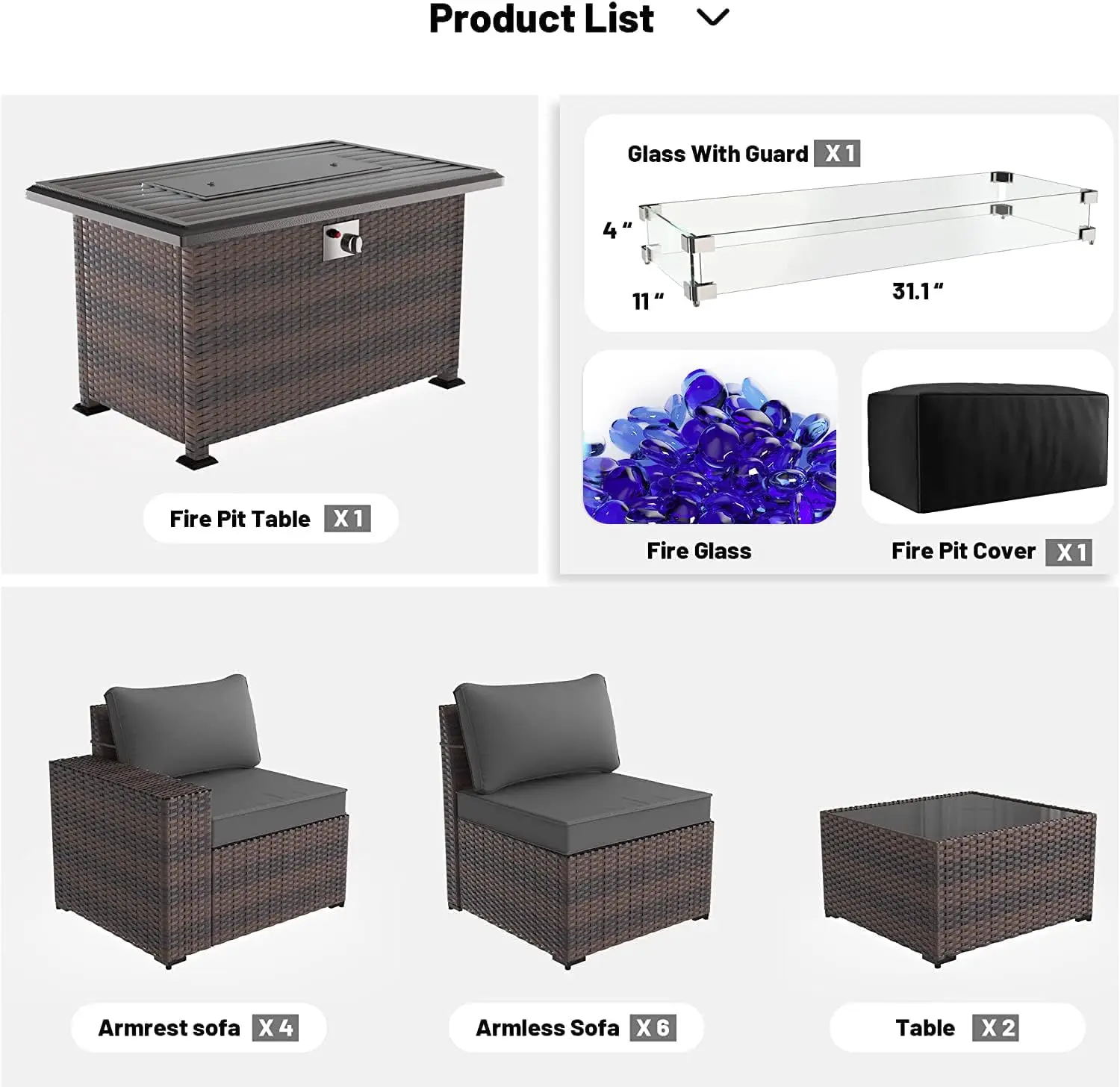 - LUXURY COMBINATION: patio conversation set includes 4 corner sofas ,6 middle sofas with Cushions , 2 tempered glass tables, propane fire pit table with glass wind guard,fire glass,slide out tank holder,lid, table cover.You can easily put them together according to the instructions with all included necessary tools and hardware. Please do not tighten the screws until you align all the holes of the wicker chair.