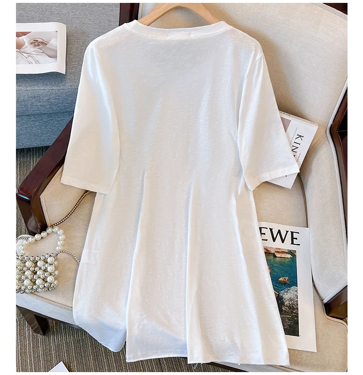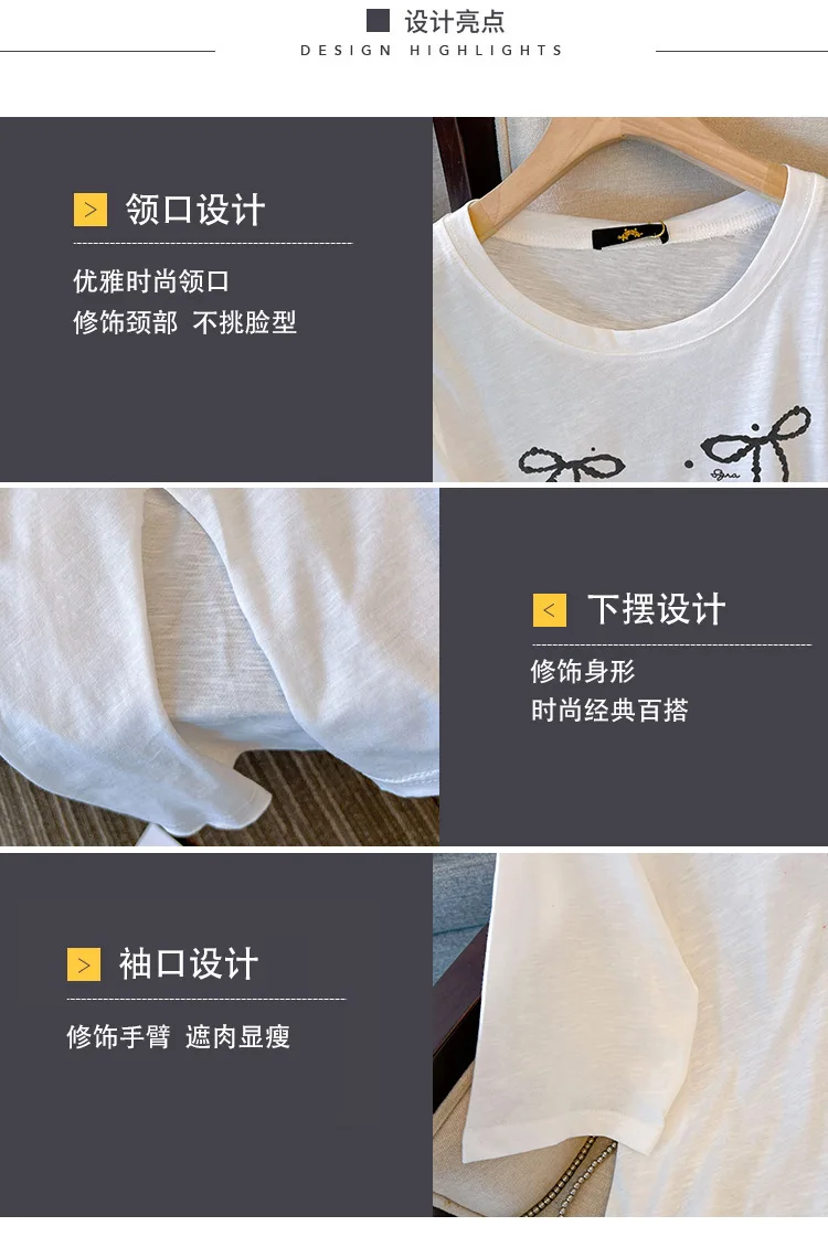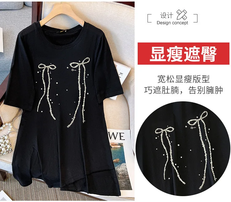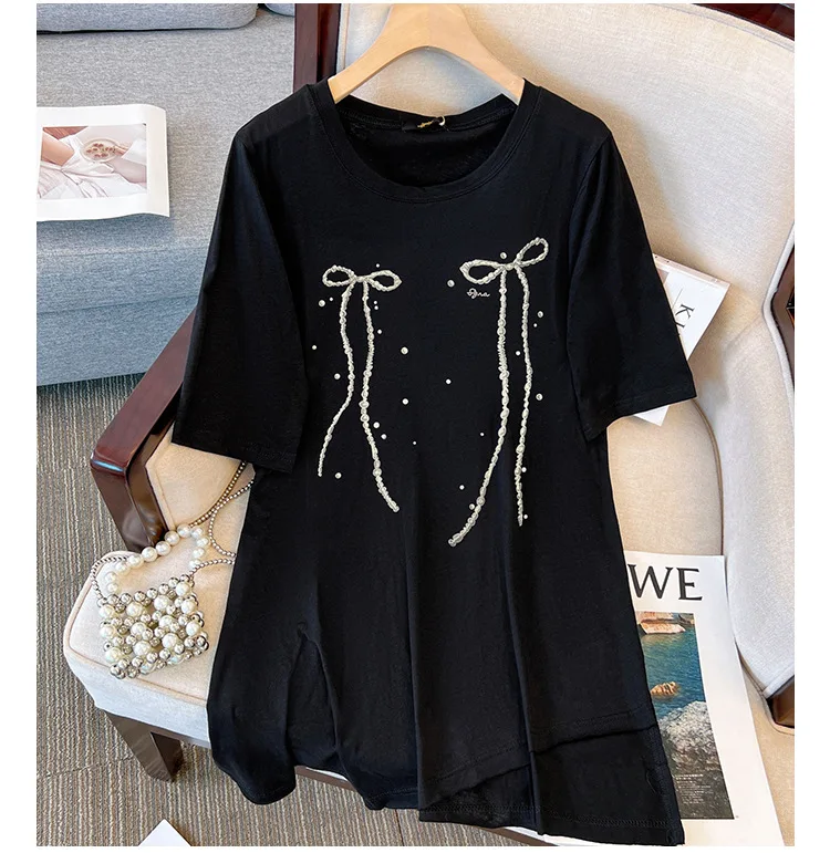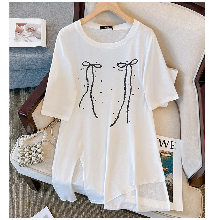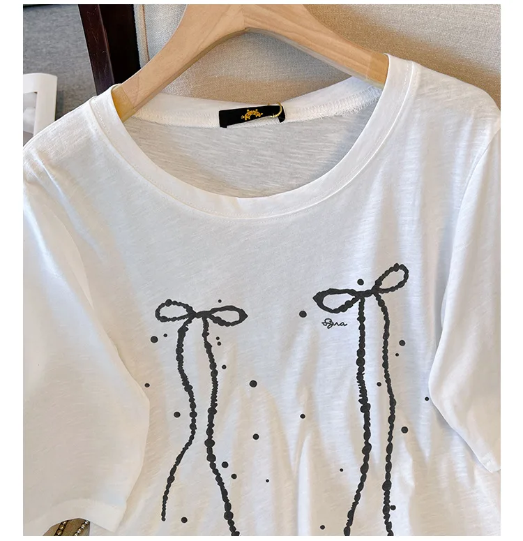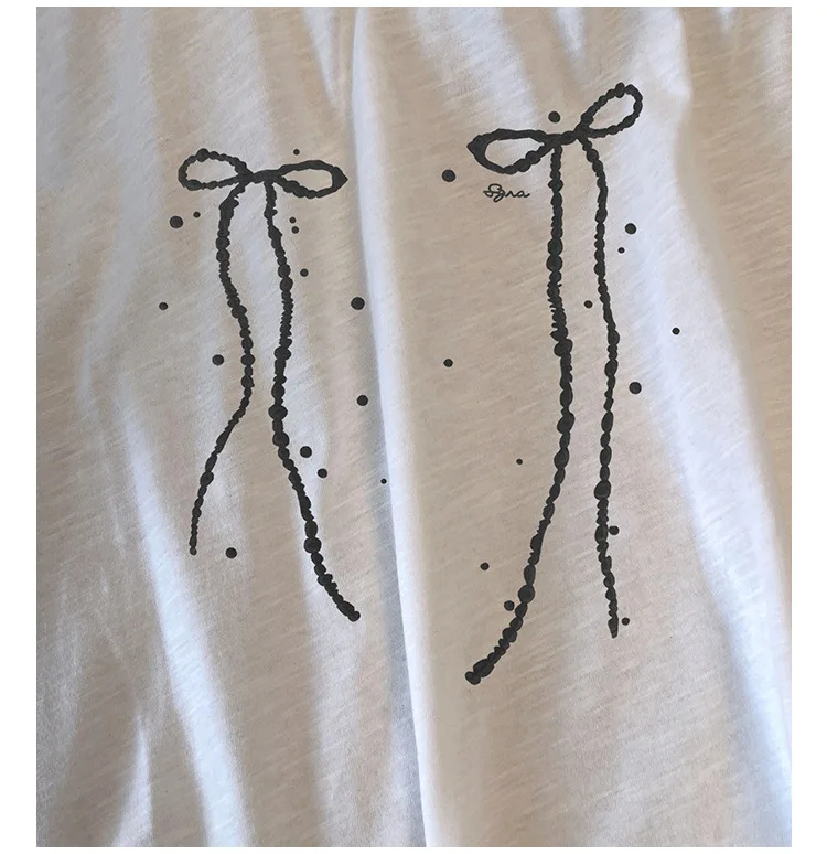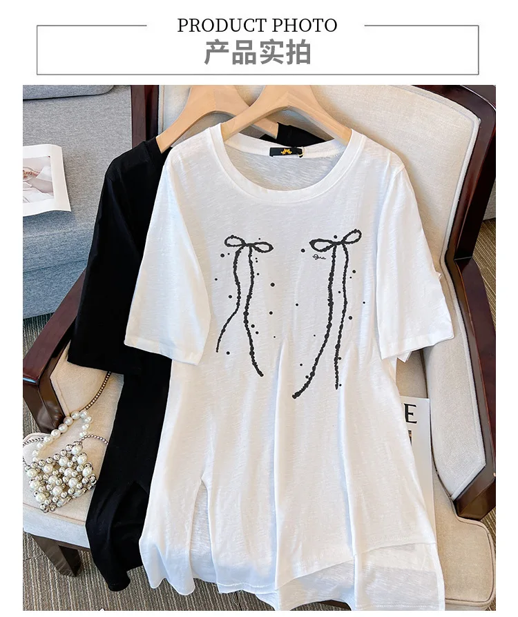 150Kg Plus Size Women’s Bust 153 Summer Short Sleeved T-Shirt Fresh Bow Print Top Black White 5XL 6XL 7XL 8XL 9XL