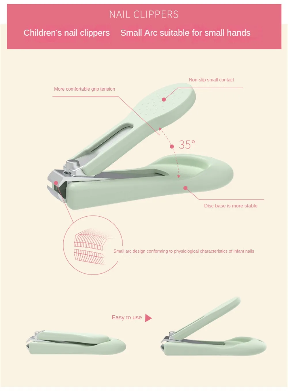 2. disc base is more stable, and the small arc mouth design conforms to the physiological characteristics of infant nails, and the safety round head tweezers can be clamped without accidental injury.