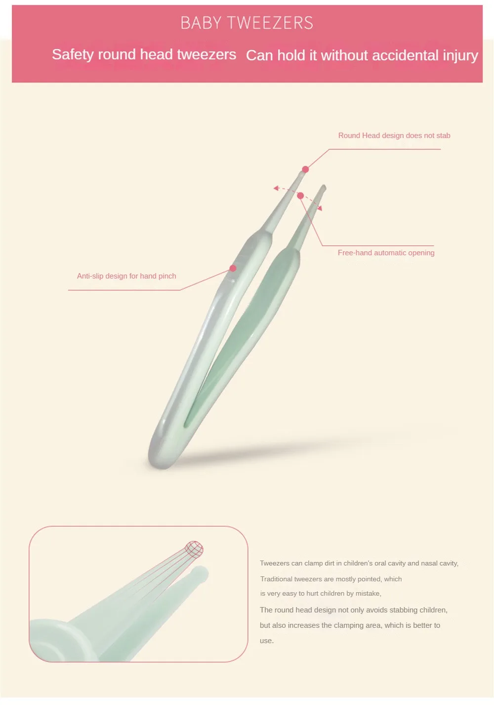 5. Tweezers can pick up dirt in children’s oral cavity and nasal cavity. The round head design increases the picking area and is better to use.