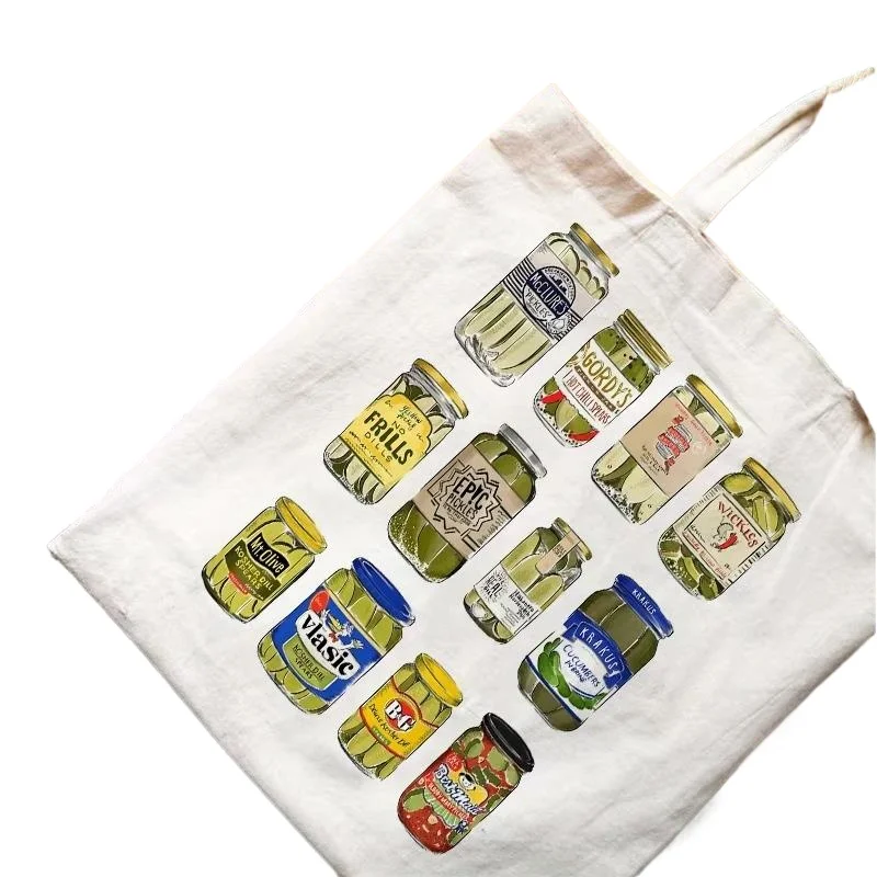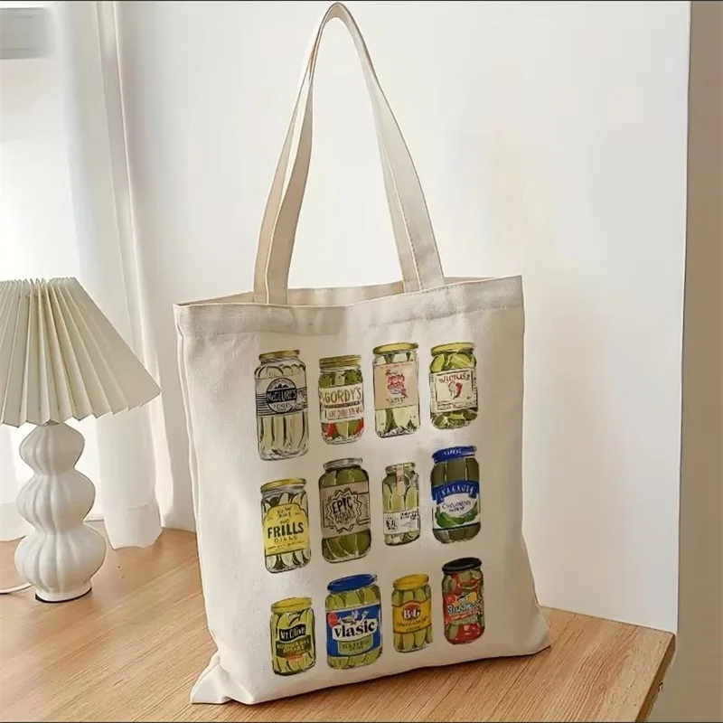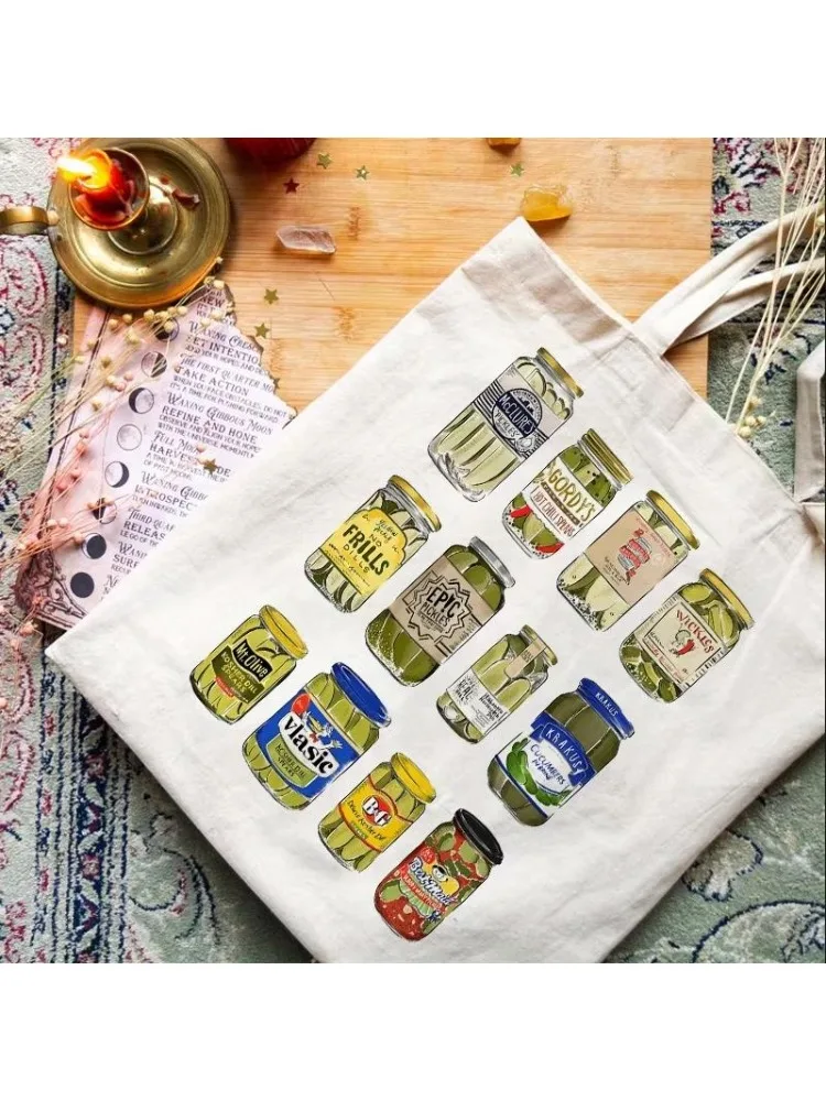 1pcs Pickle Pattern Tote Bag Trendy Casual Shoulder Bag Vintage Canned Pickles Tote Bag Funny Canvas Shoulder Bags