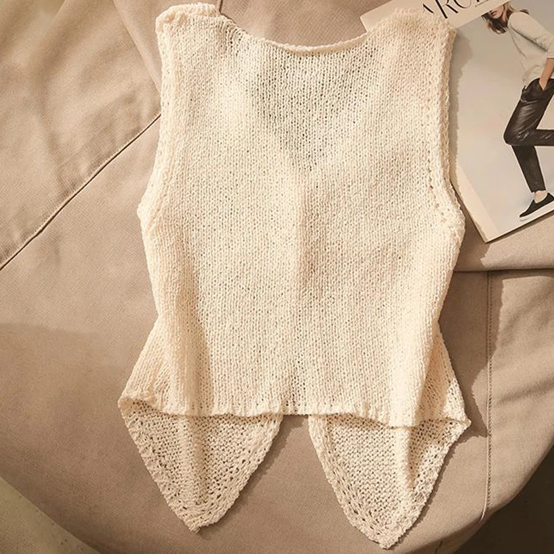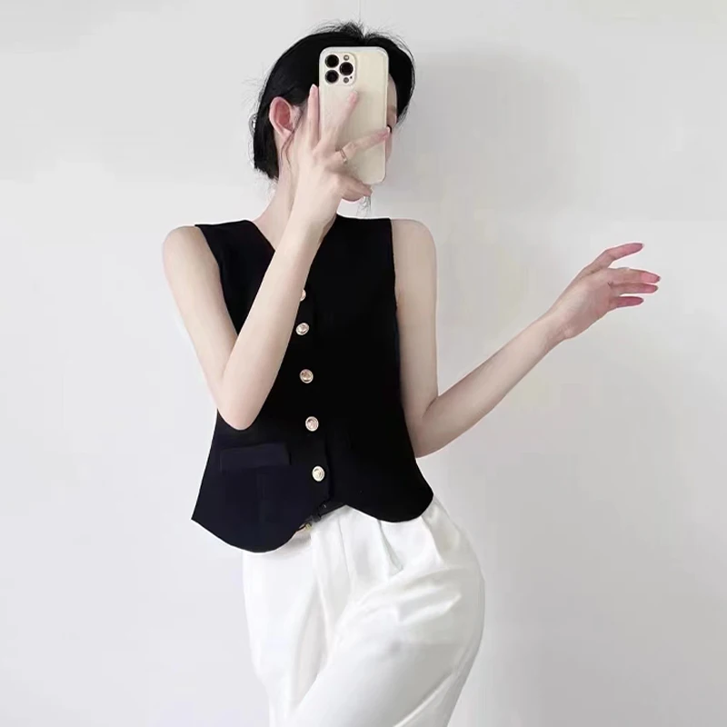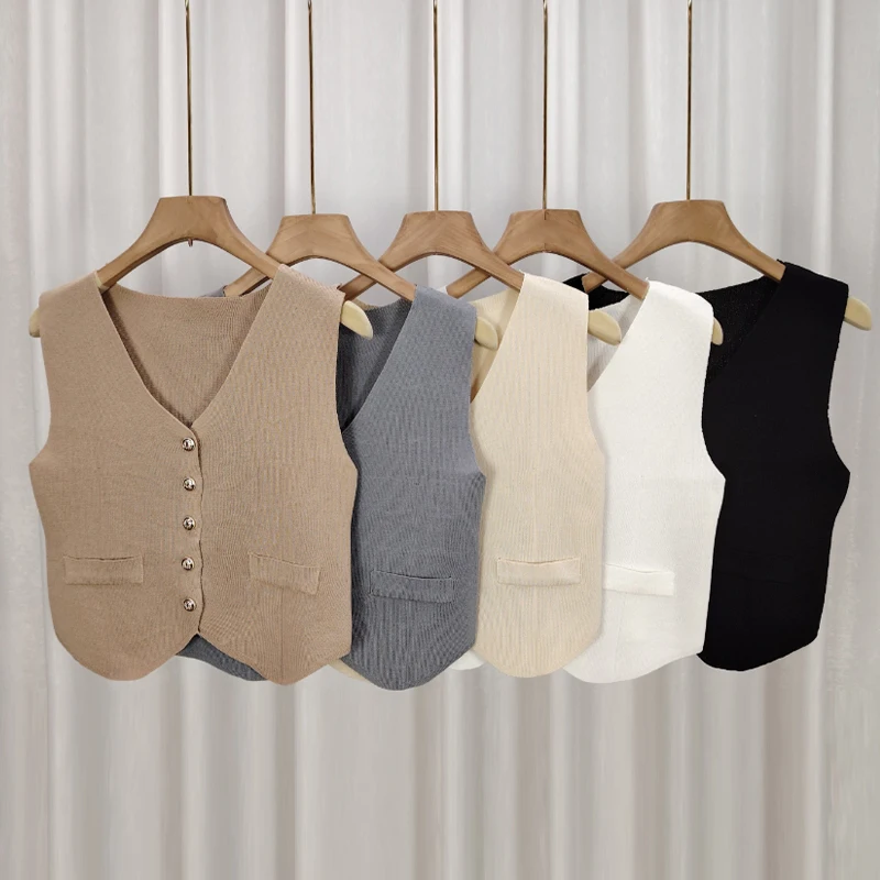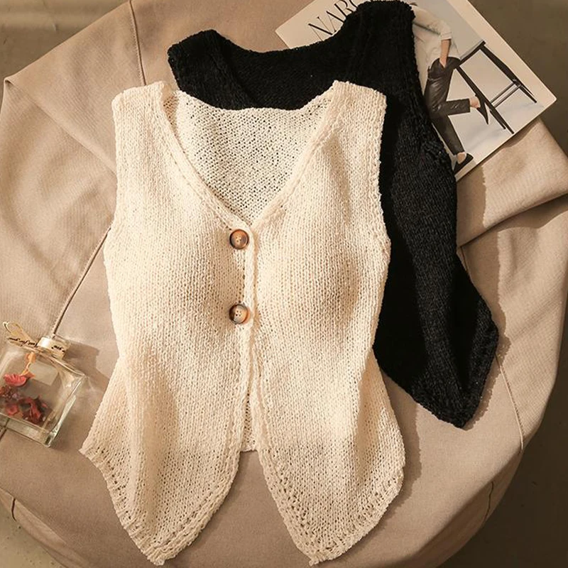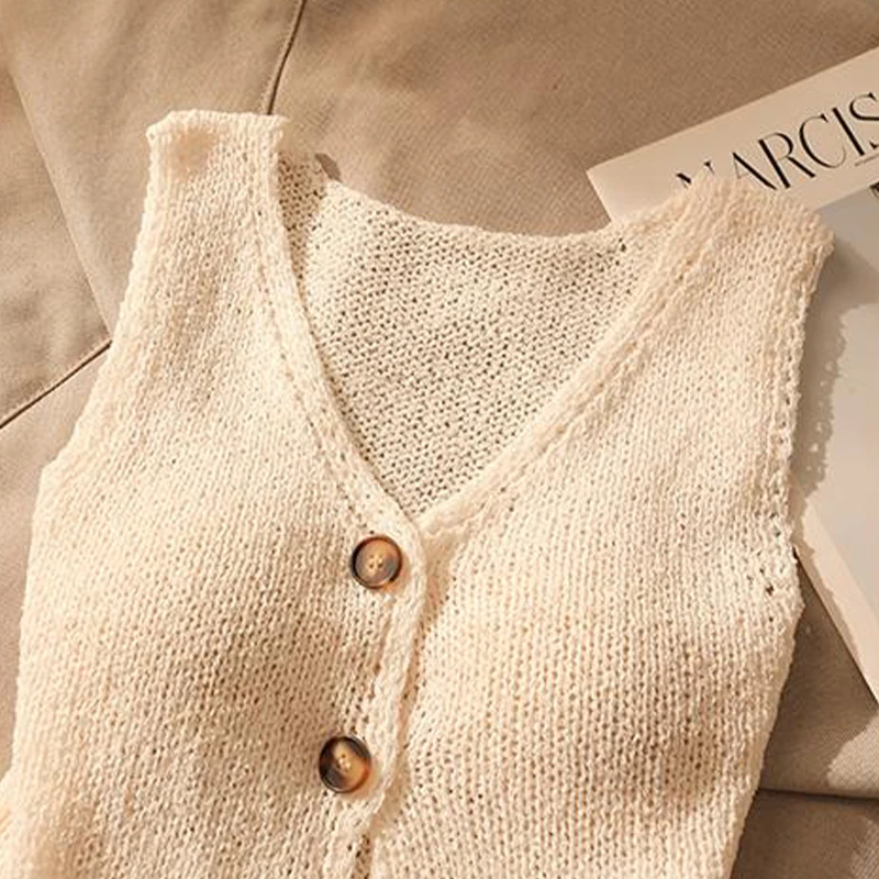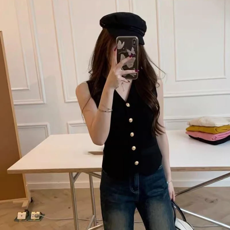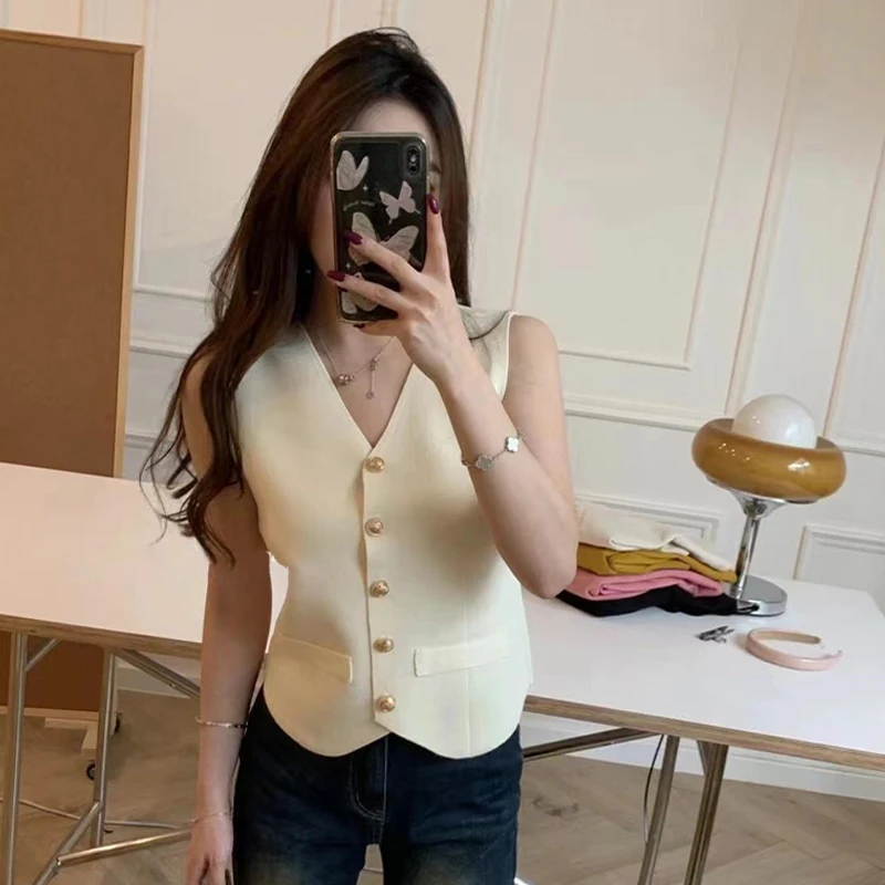 1pcs Vest French Temperament V-neck Single Breasted Sleeveless Slim Knitted Vest For Women