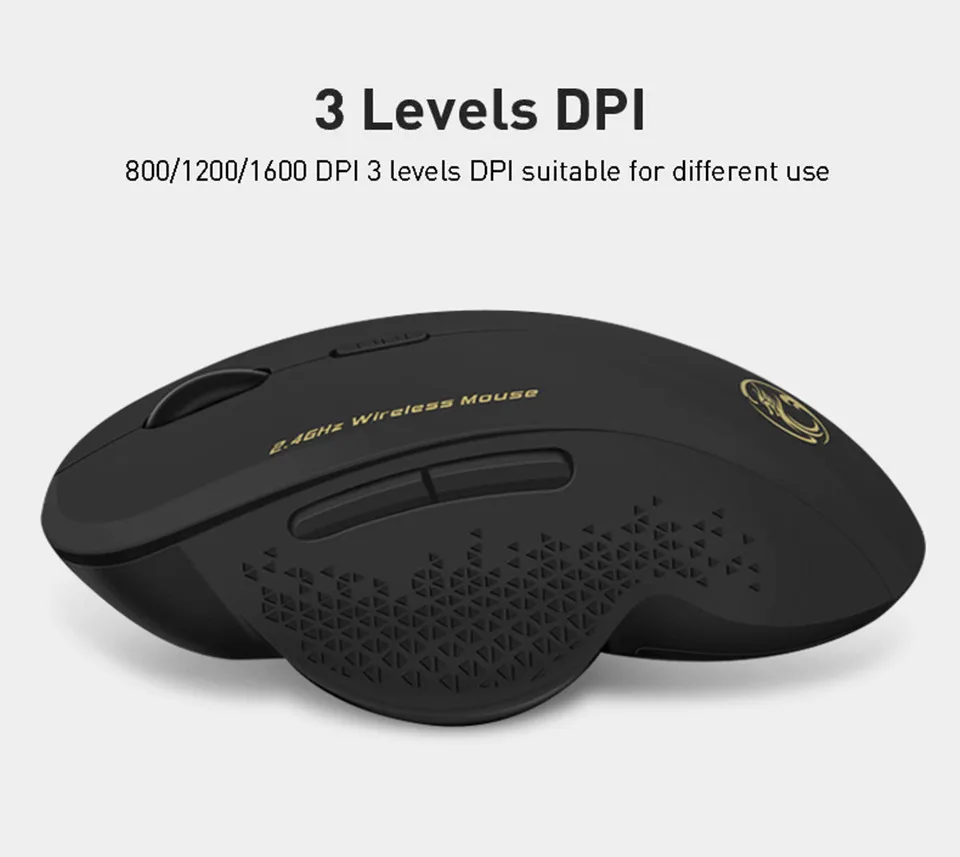 This 2.4G wireless mouse works via a USB interface connection (the USB interface is on the bottom of the mouse). The mouse has 6 buttons and has three DPI adjustments: 800, 1200, 1600. The working range of the mouse is 10 meters. The keystroke life of the mouse can reach 10 million times.