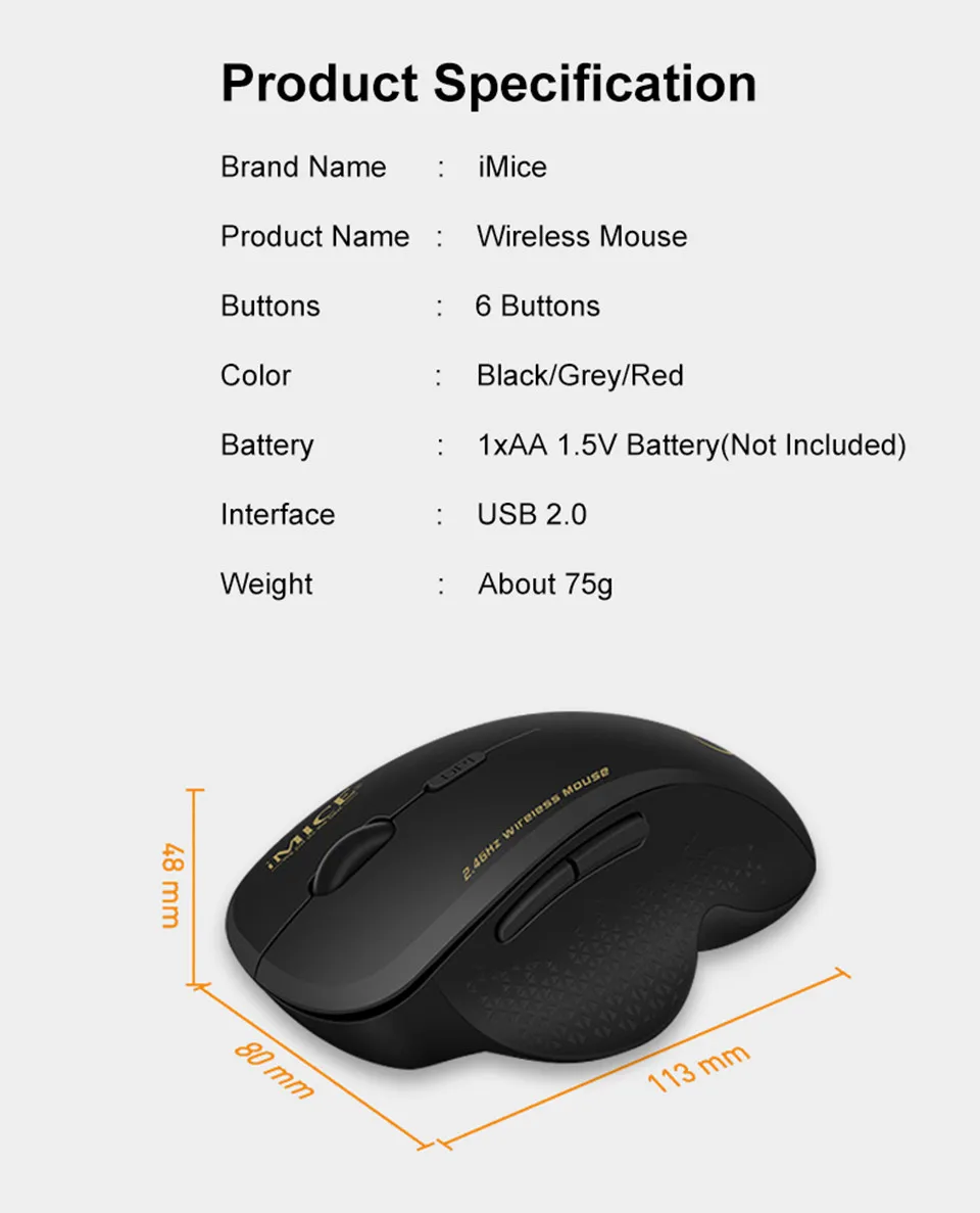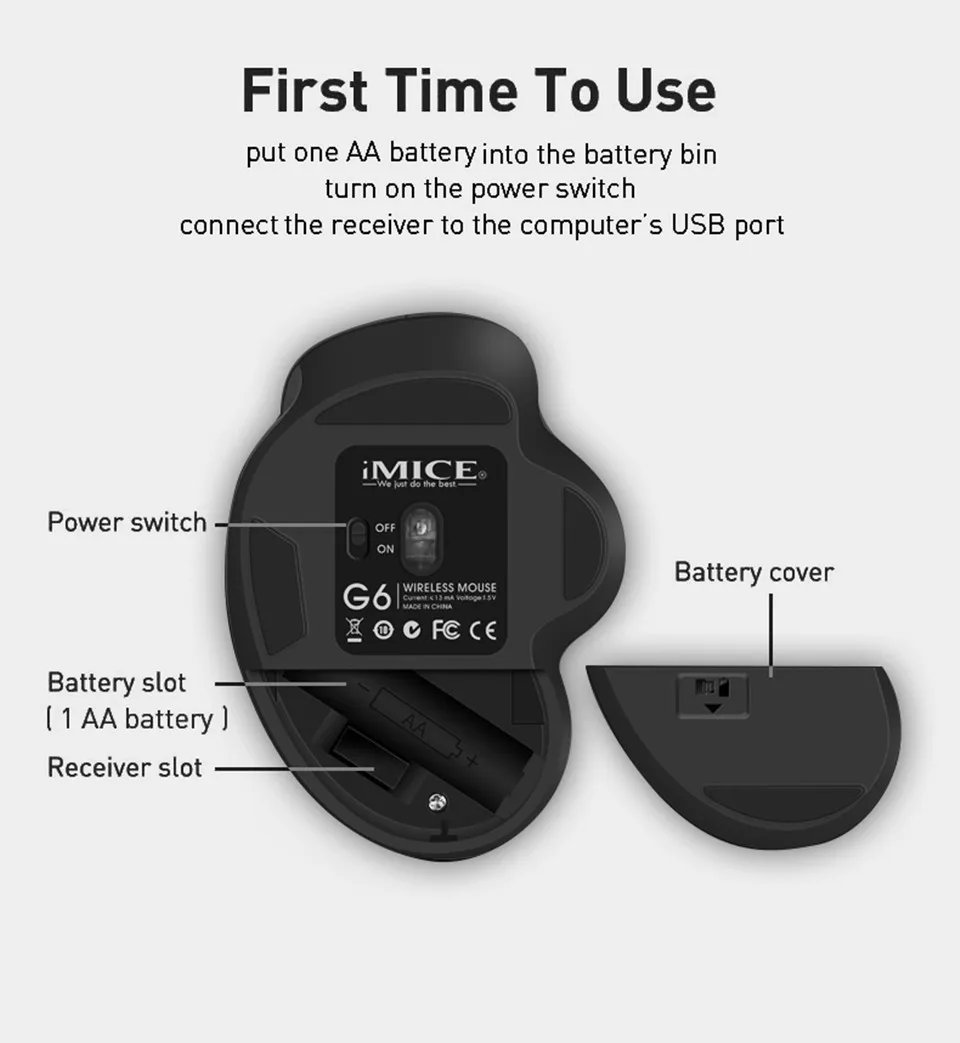 The mouse operates on 1 * AA battery power (not included). The bottom of the mouse is equipped with a power switch, which can be turned off when the mouse is not used for a long time.