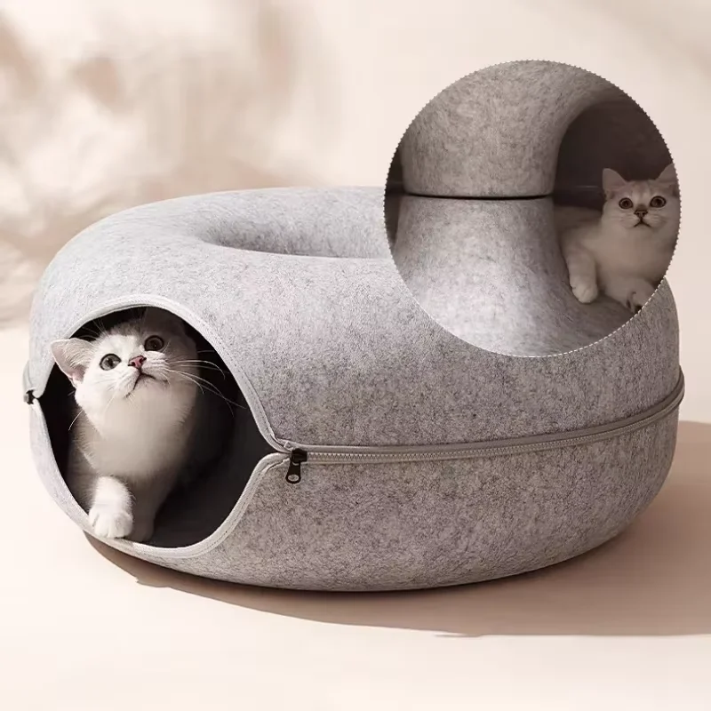 2 in 1 Tunnel for Cats Bed Felt Donut Bed for Cats House With Breather Hole Dog Bed Interactive Play Toys for Cats to Hide