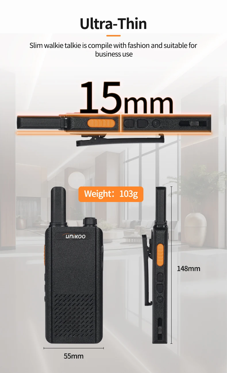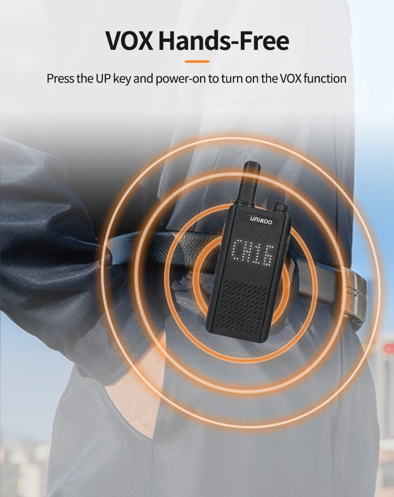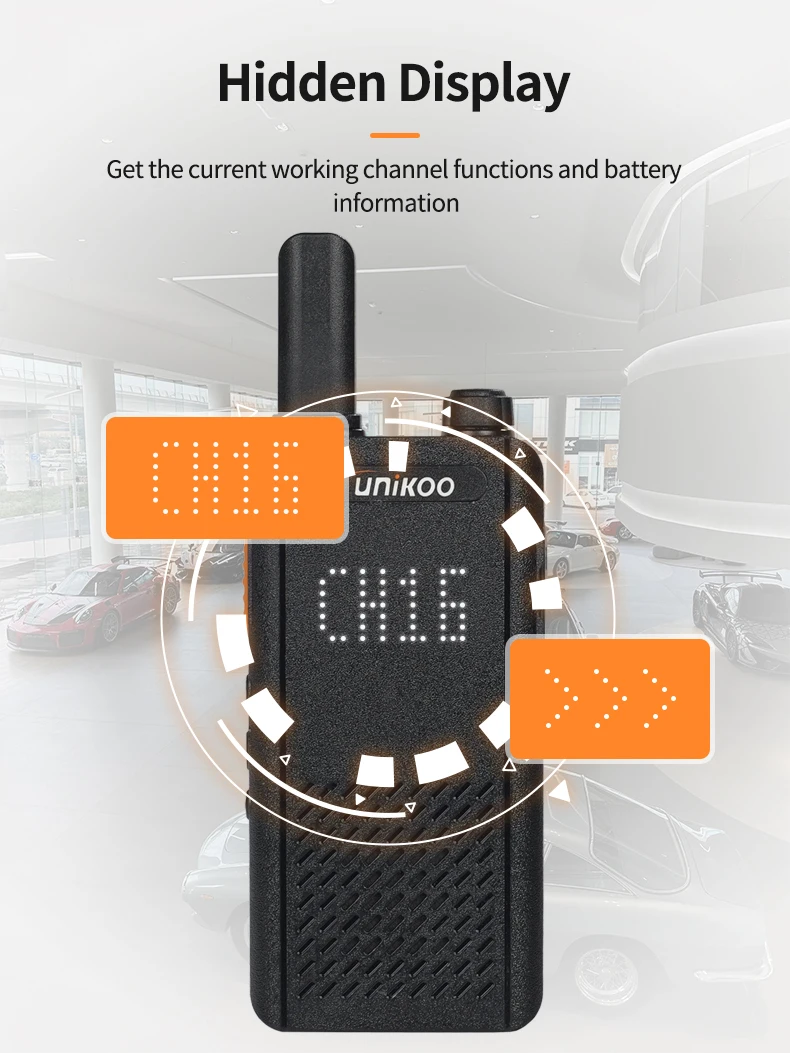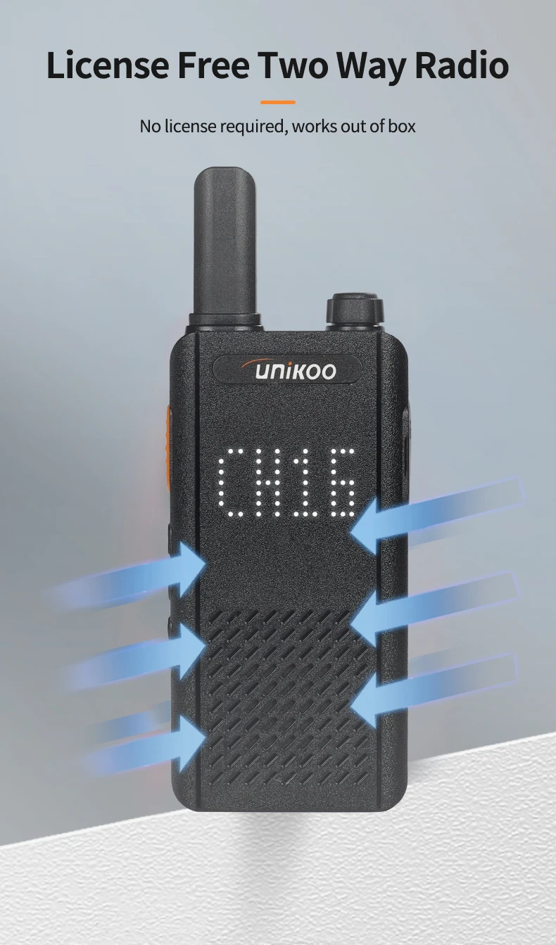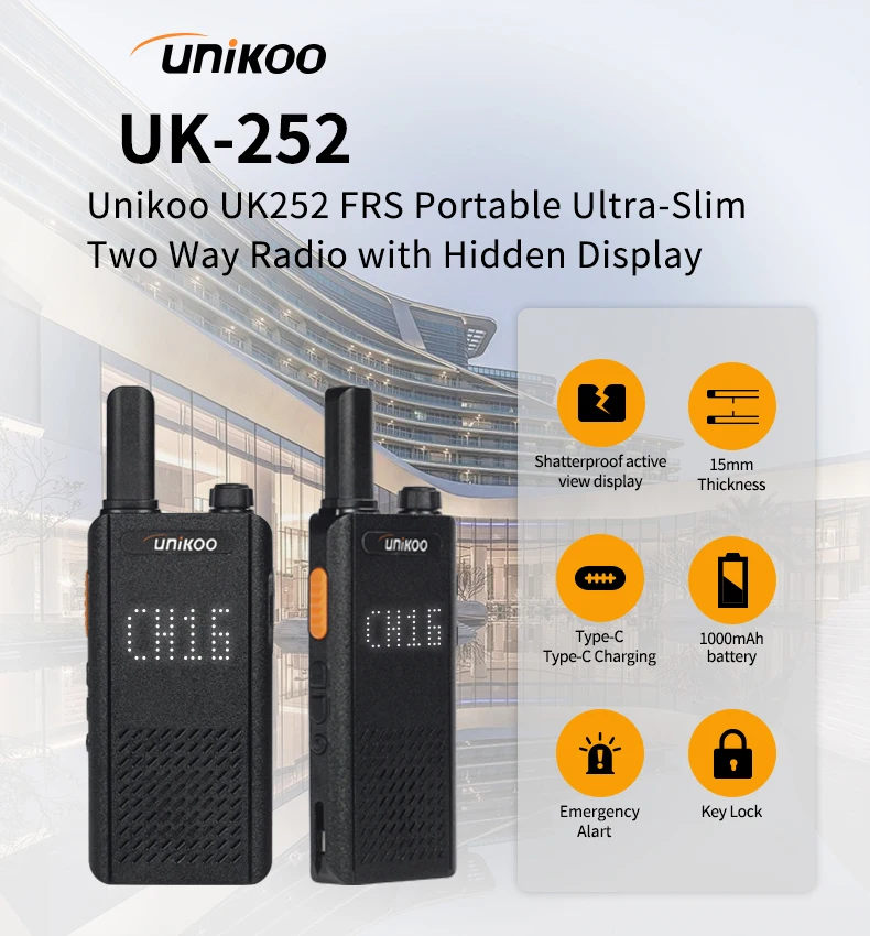 UNIKOO UK252 license free walkie talkie adopts an ultra-thin and lightweight design. With a slim 15mm ultra-thin body, UK252 portable walkie talkie easily fits into any pocket. It features a shatterproof hidden display, allowing you to stay connected without compromising on style. It is perfect for small businesses including hotels and restaurants, as well as in other places like schools and churches.