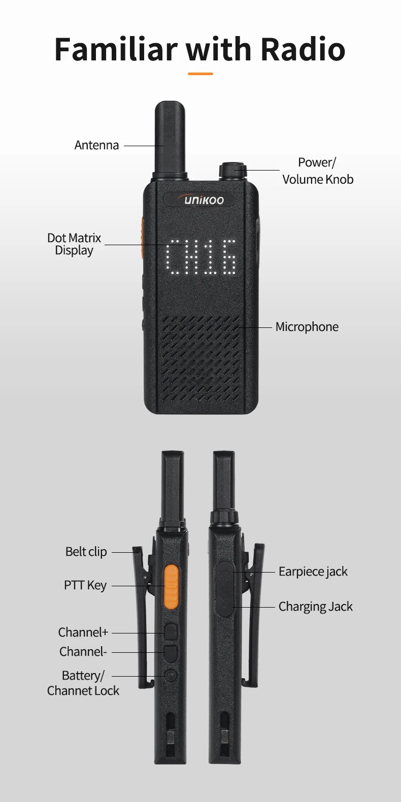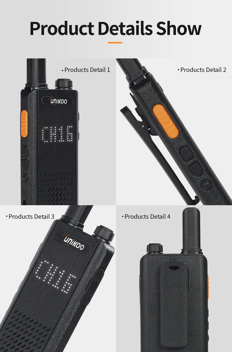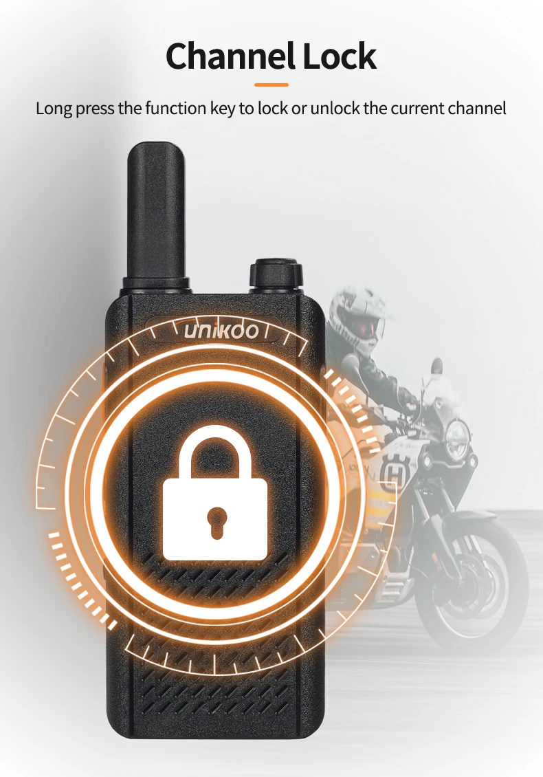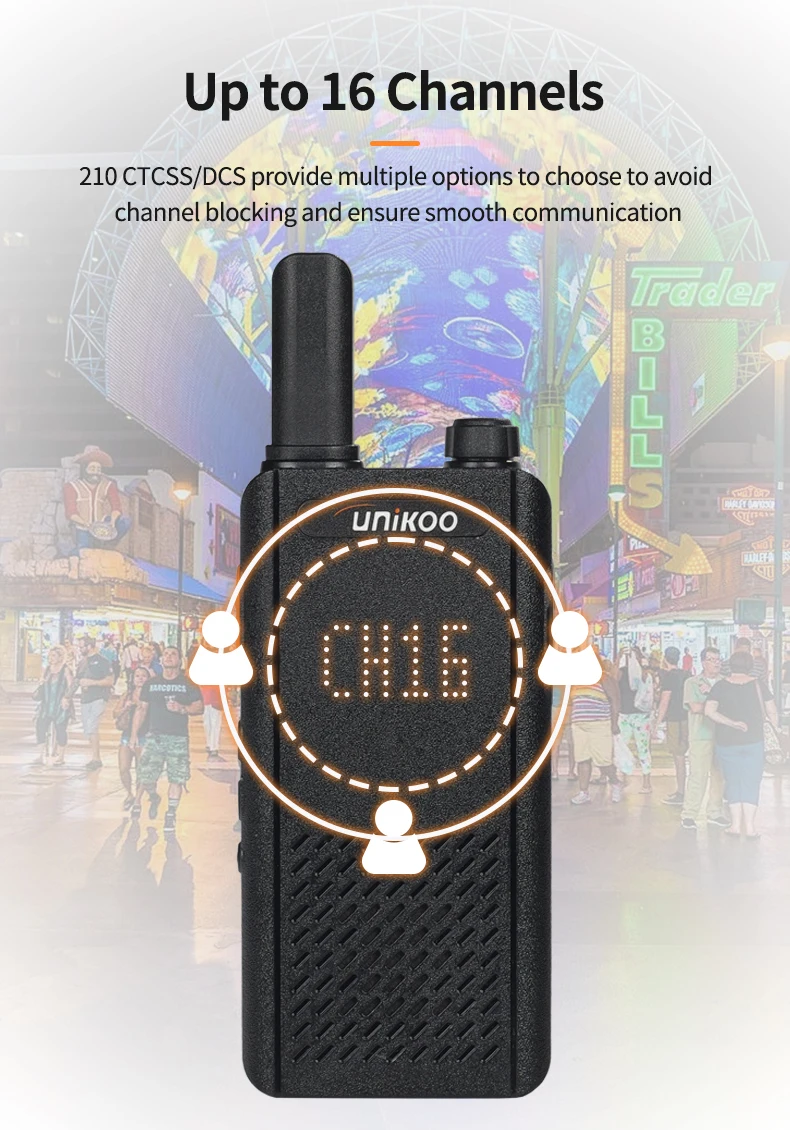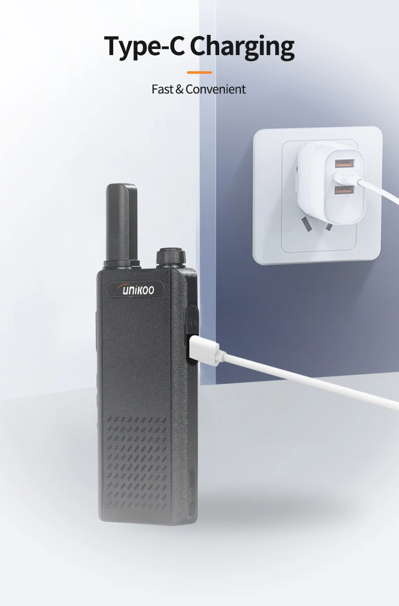 UNIKOO UK252 license free walkie talkie adopts an ultra-thin and lightweight design. With a slim 15mm ultra-thin body, UK252 portable walkie talkie easily fits into any pocket. It features a shatterproof hidden display, allowing you to stay connected without compromising on style. It is perfect for small businesses including hotels and restaurants, as well as in other places like schools and churches.