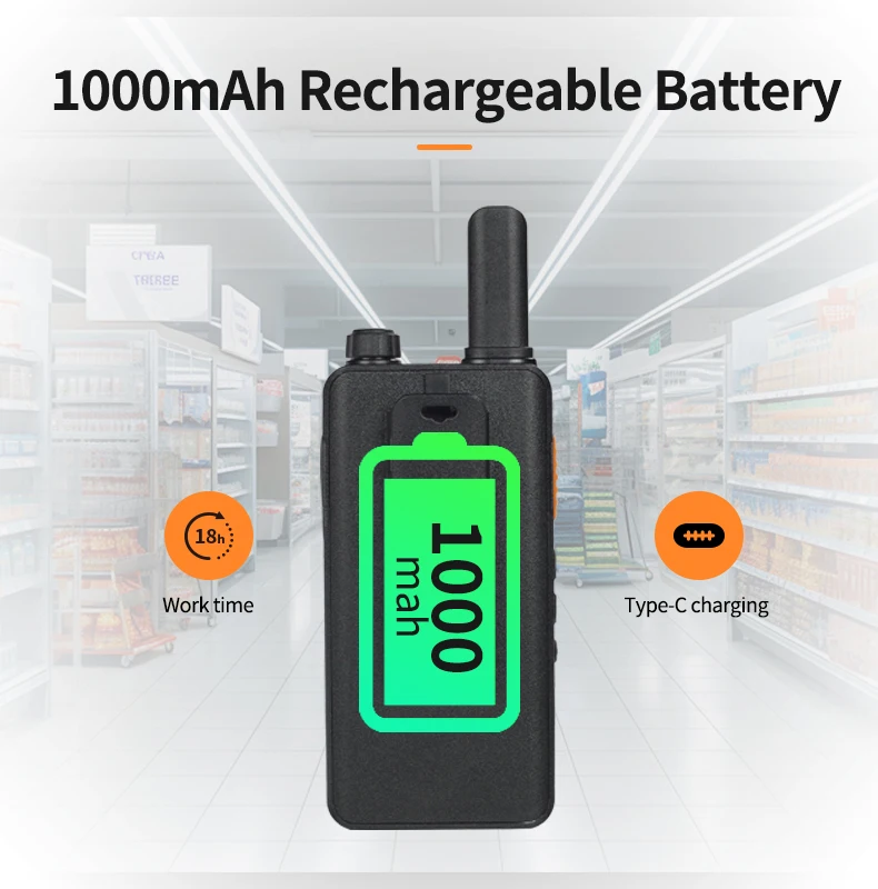 With a 1000mAh large capacity Li-ion battery, UK252 FRS 2-way radio usually takes 3-4 hours to fully charge, providing up to 18 hours of working time and 49 hours of standby time