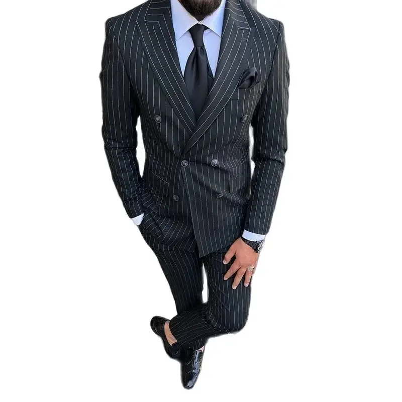 2 Piece High Quality Black Stripe Men’s Suits Peak Lapel Double Breasted Male Clothing Prom Party Elegant Wedding Jacket Pants