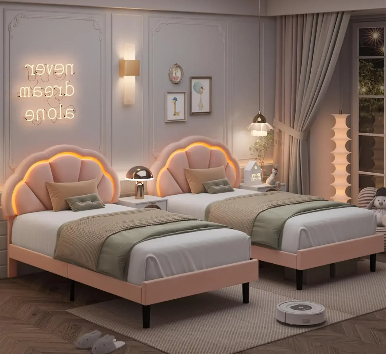 2 Set Twin Upholstered LED Bed Frame with Adjustable Dreamy Petal Headboard, Soft Velvet Princess Platform Bed for Girls/Kids