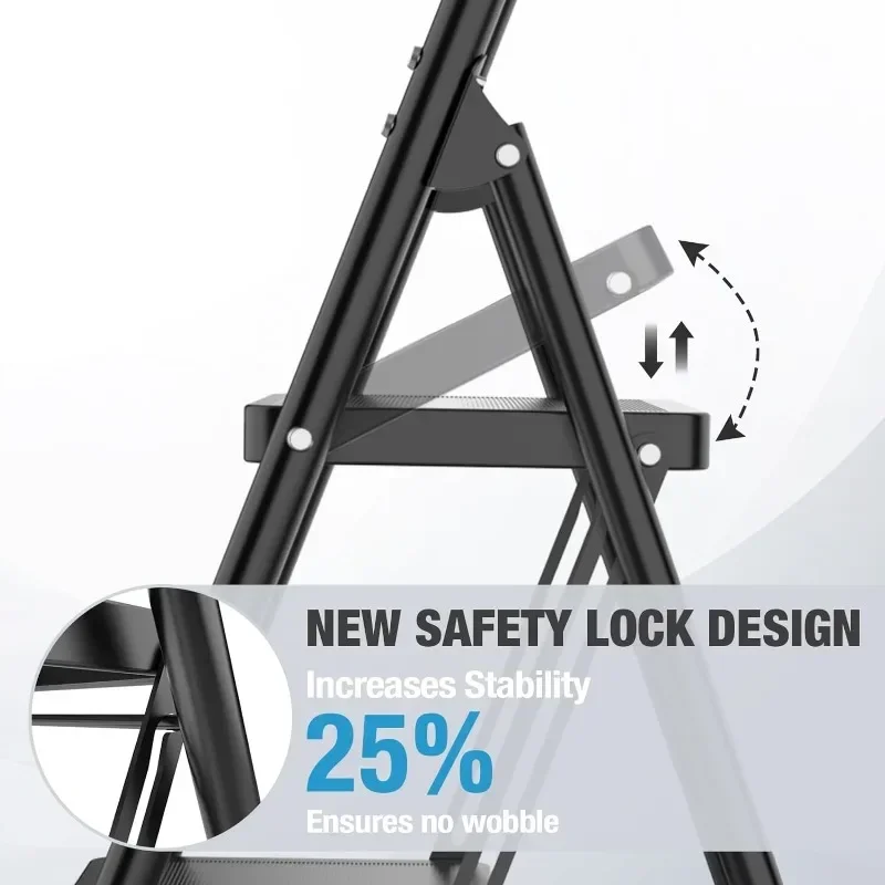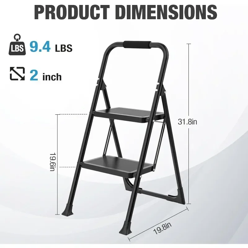 - New Lock-Free Design : 2-step ladder with a support rod design.The tight connection between the bracket and the main body ensures stability without any shaking. To use the ladder, simply push down the top pedal, and the safety locking mechanism will automatically lock in place, ensuring your safety while you work.