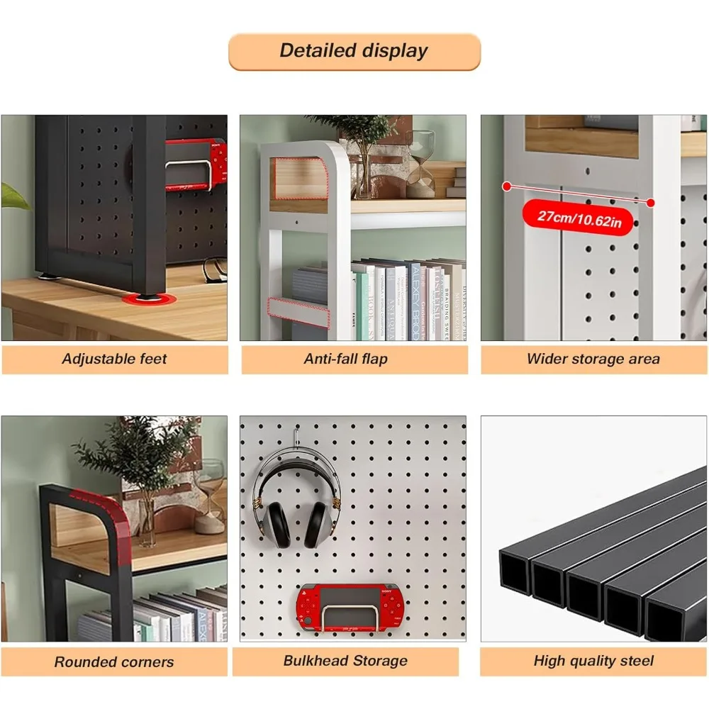 - 【Humanized Design】:The rounded corners of the retro desk storage rack prevent daily collisions; the left and right back baffles of the storage rack prevent items from falling, and the adjustable foot nails protect the desktop from damage. The usage scenarios are diverse. An additional work area in the kitchen. Use as a practical storage cupboard in the lobby, or as a bookshelf in the study or children’s room. Support any home and office desktop storage needs.