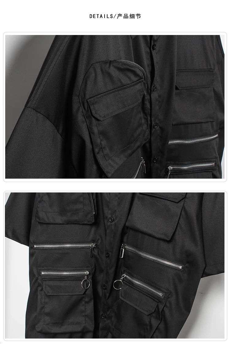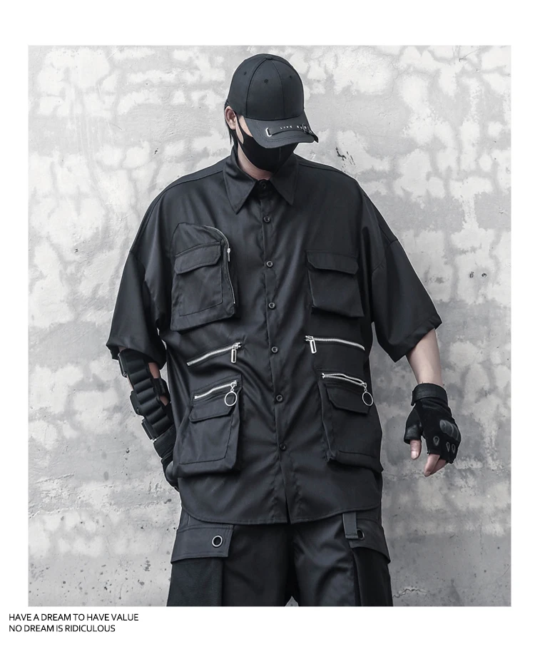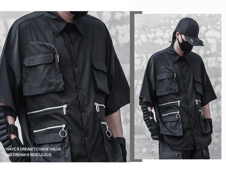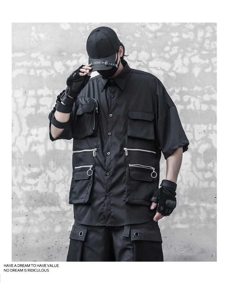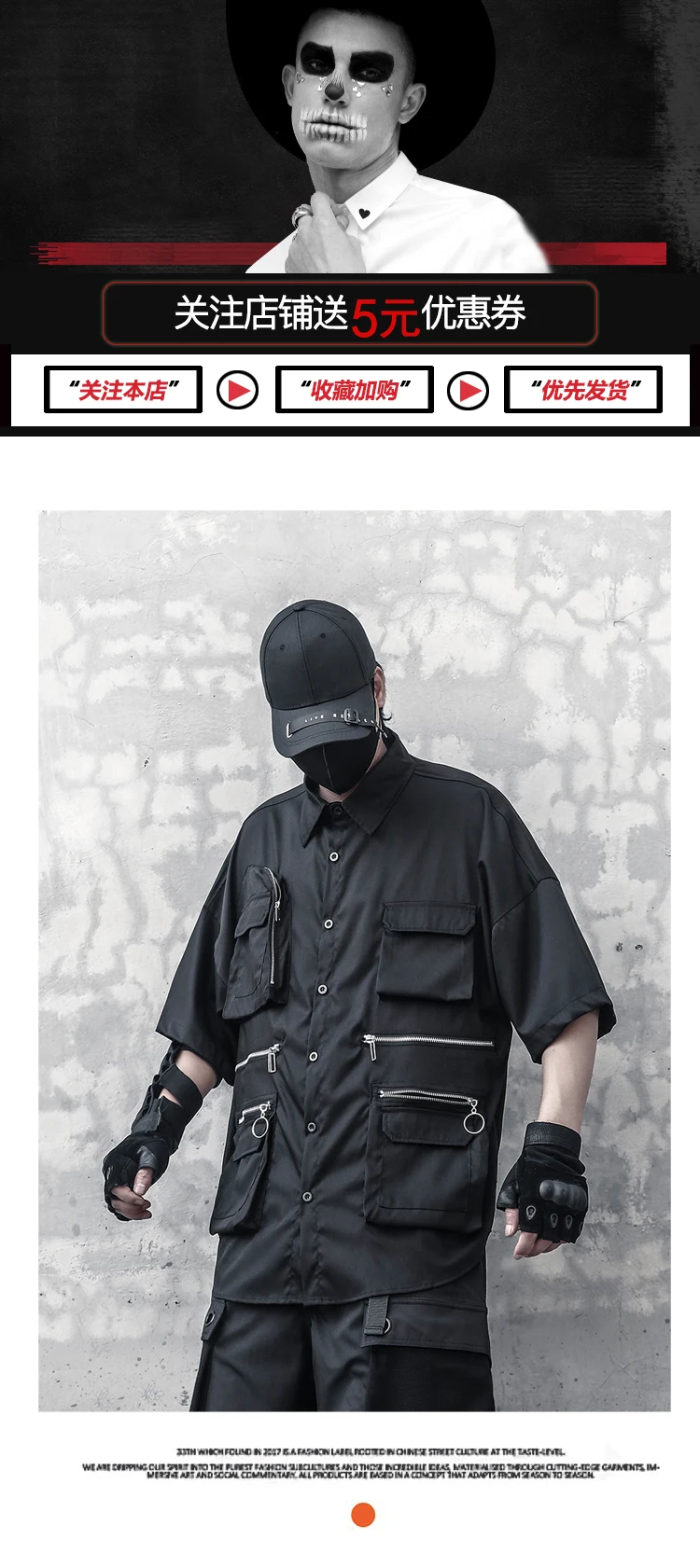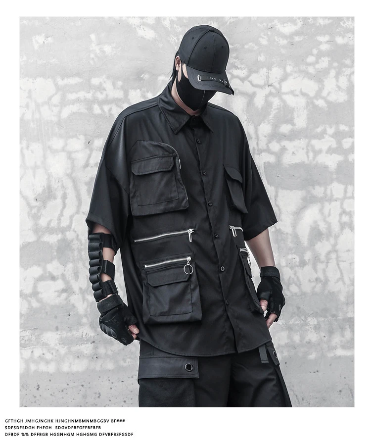 2023 Multi-pockets Tactical Techwear Cargo Shirt Mens Gothic Punk Hip Hop Short Sleeve Shirts Streetwear