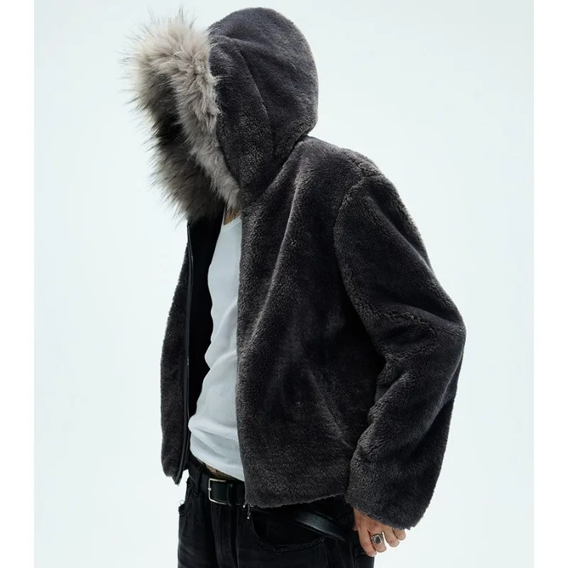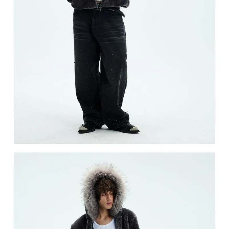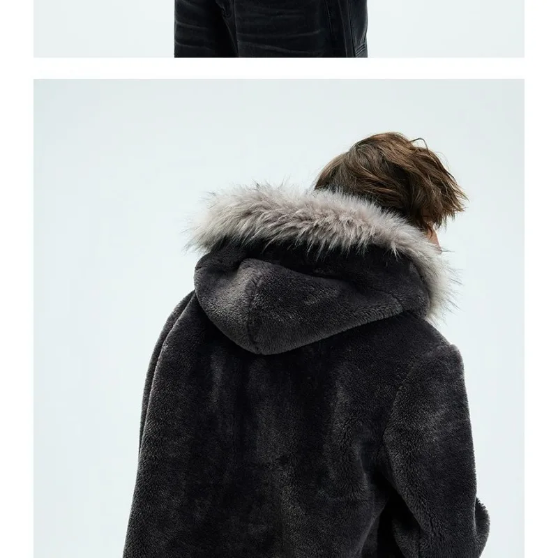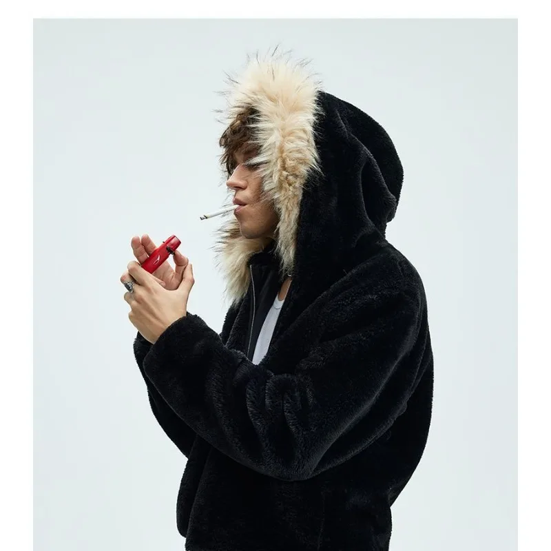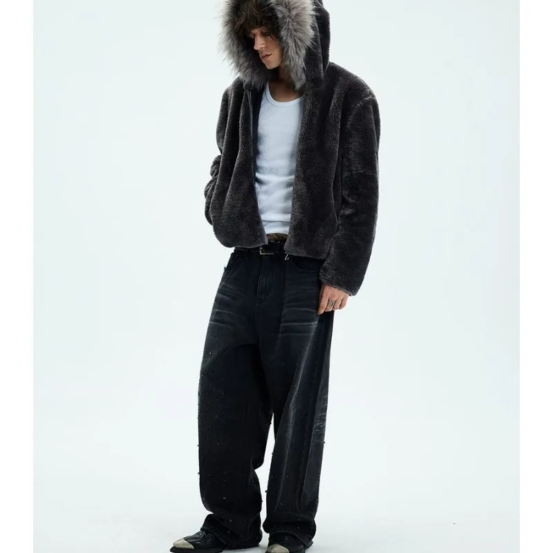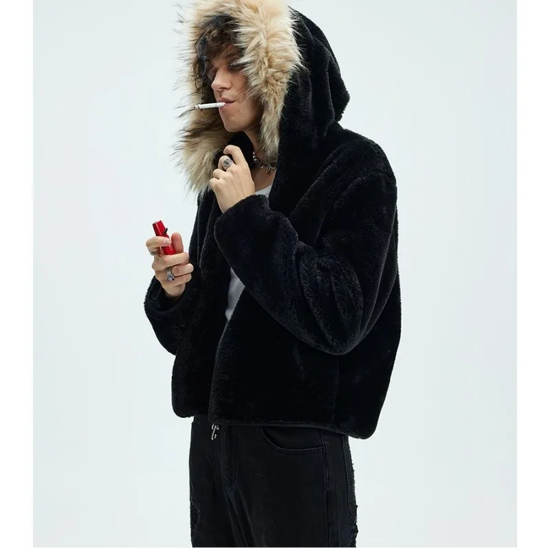 2024 Autumn and Winter New Fashion Solid Color Hooded Fur Mao Mao Jacket Men Punk Thick Warm Imitation Fox Fur Coat Trend Joker