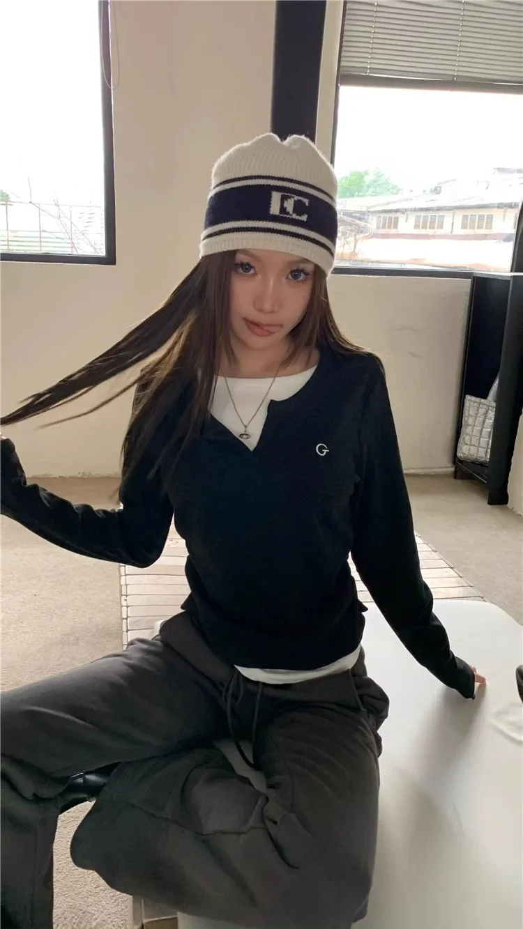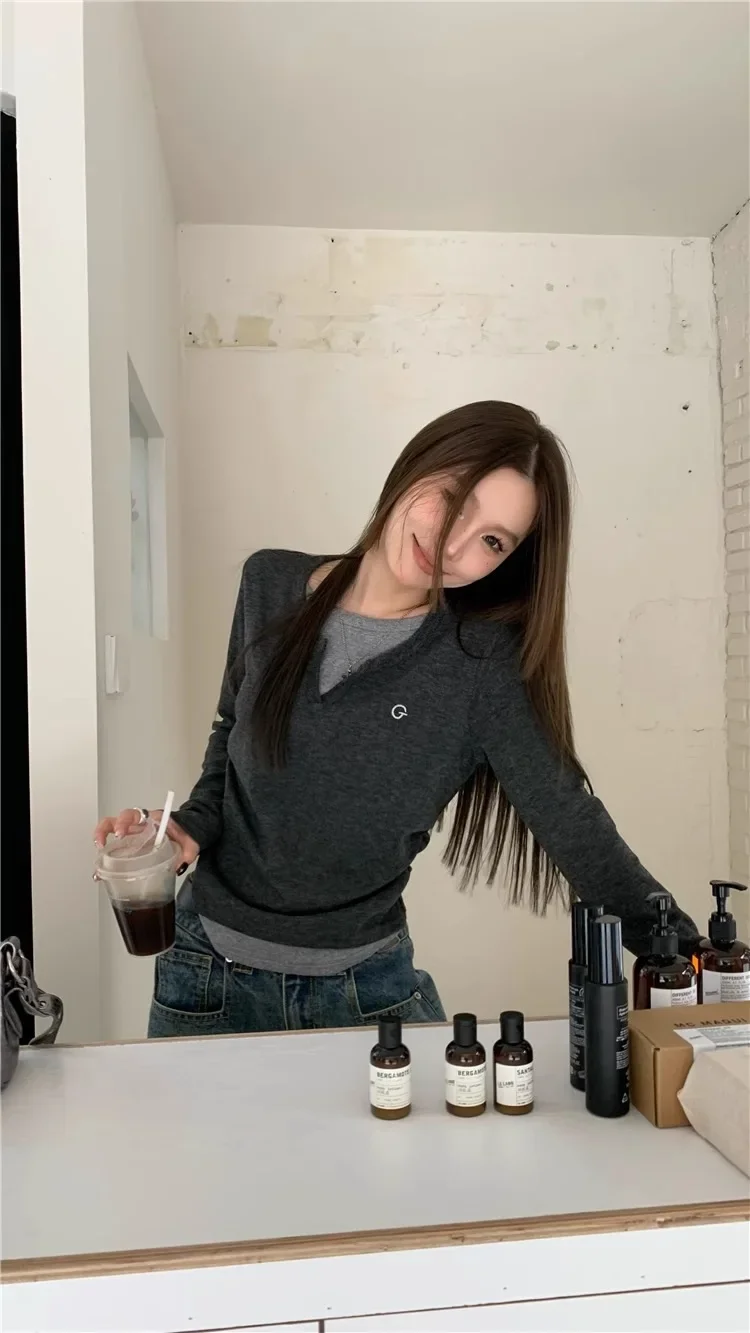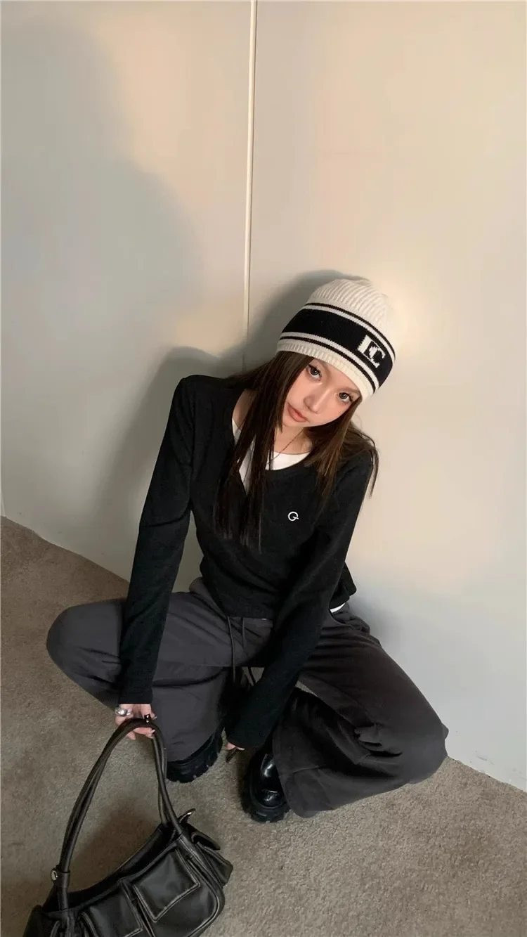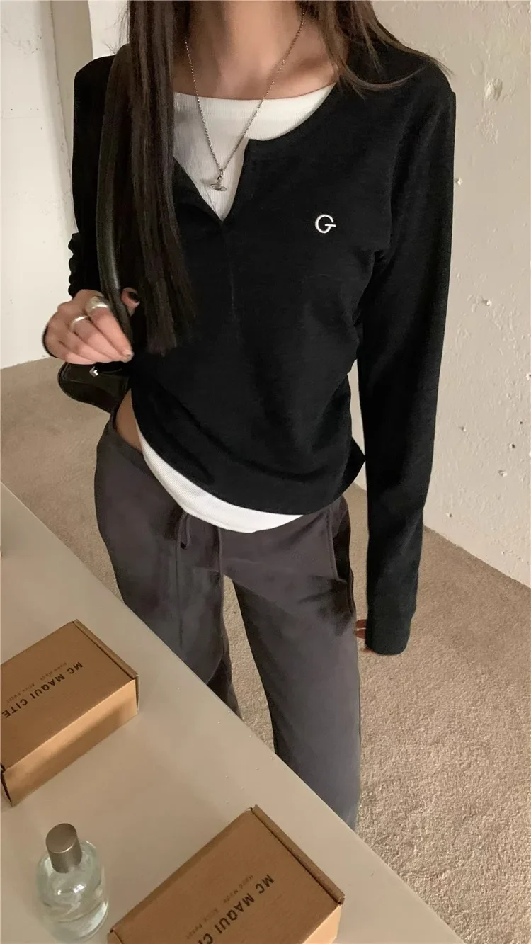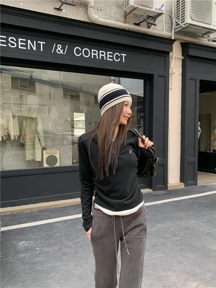 2024 Autumn Winter Long Sleeves Korean Fashion Style O-neck Tshirt For Women Fake two items T-shirts Ladies Top Tee Clothes