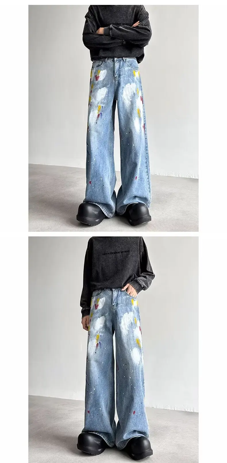 European and American Ripped Jeans for Men Fashionable High Street Wide-leg Straight-leg Jeans with Zippers and Multiple Pockets