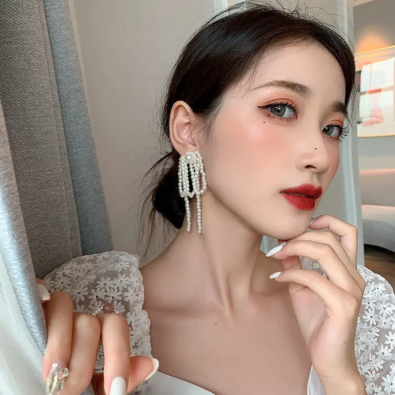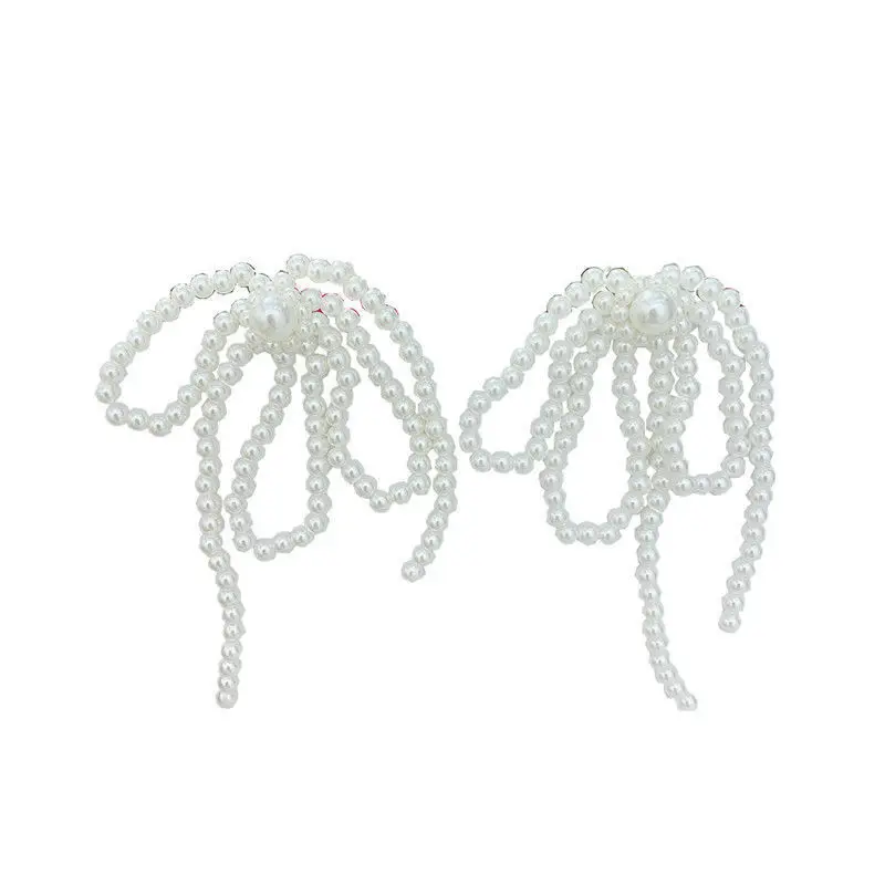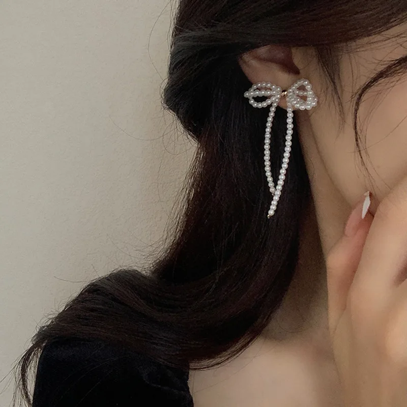 2024 Korean Bowknot Tassel Earrings Imitation Pearl Beads Bow Long Earring for Women Wedding Fashion Temperament Jewelry Gifts