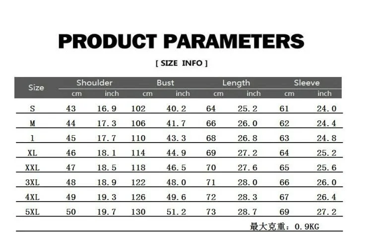 5XL =Bust 130cm , Length 73cm, Shoulder 50cm, Sleeve 69cm, Advice Weight 92-100KG, Advice Height 190-195cm