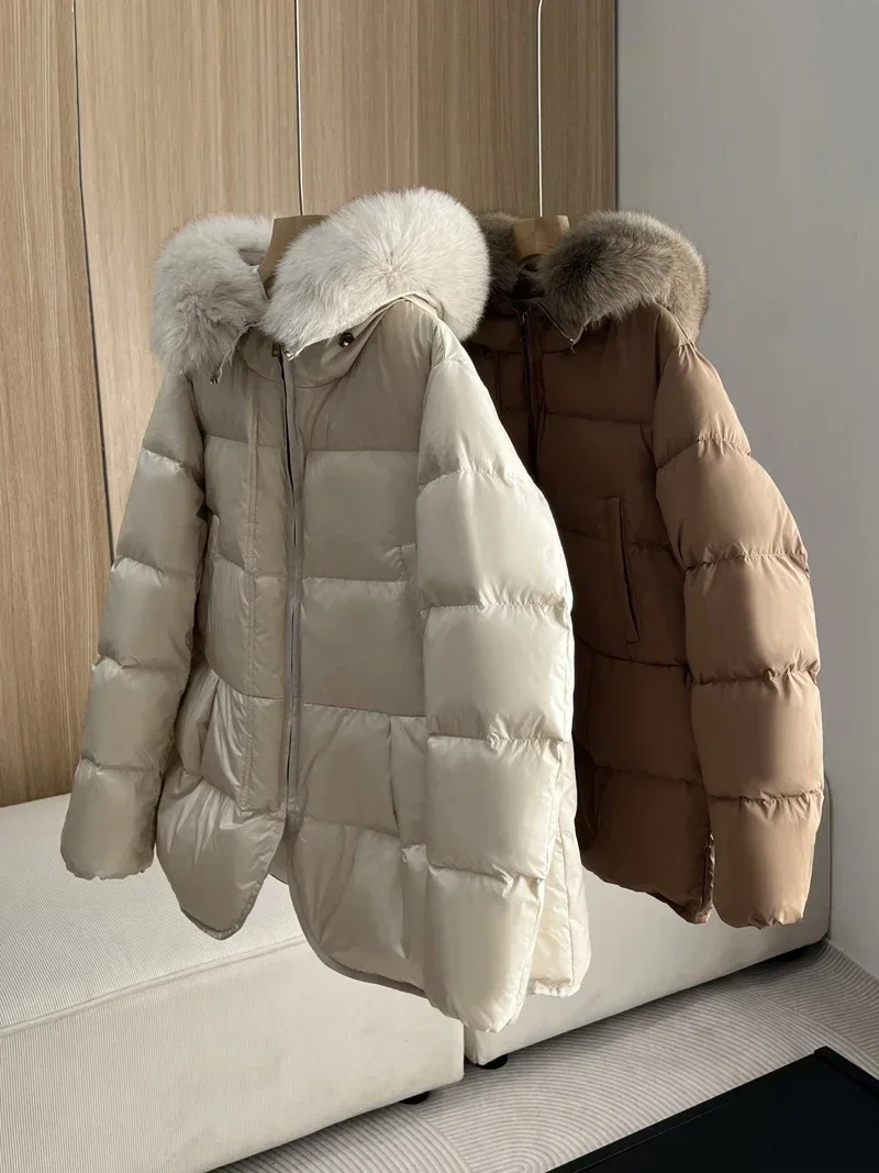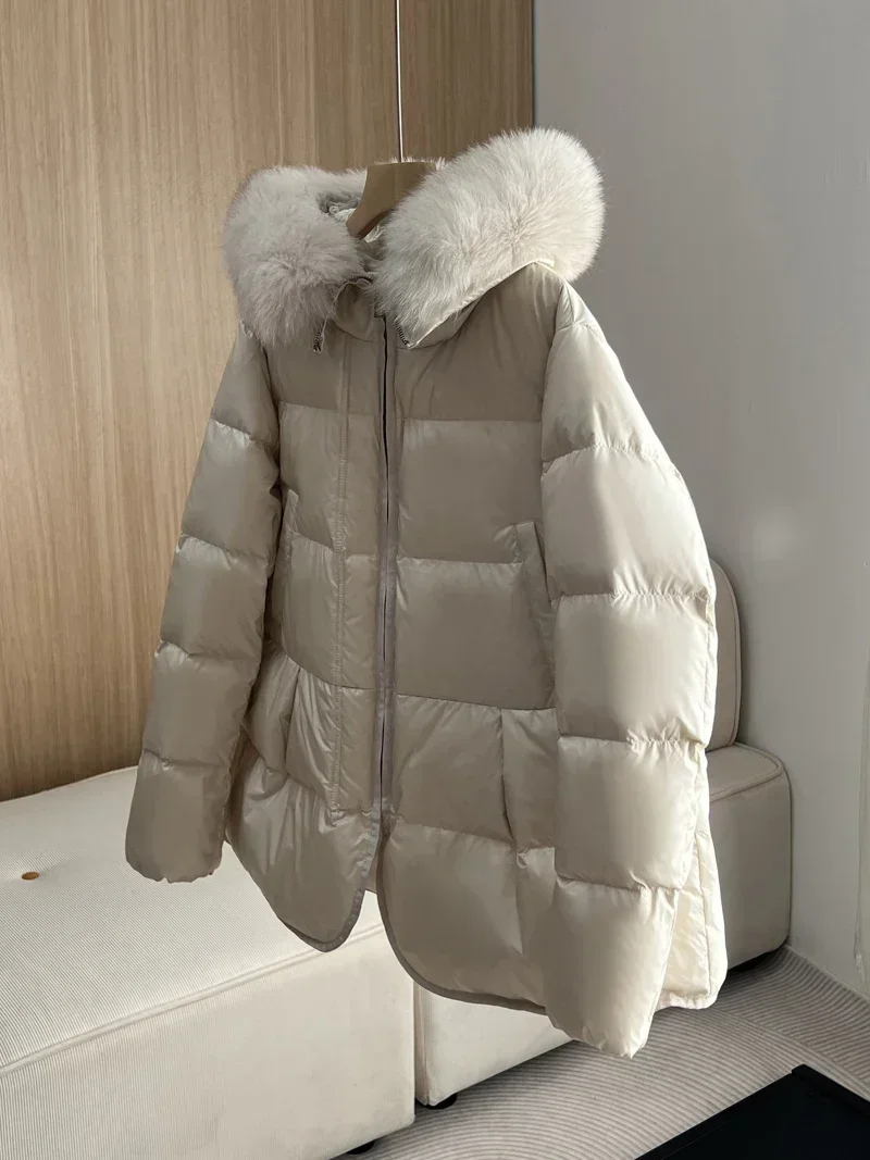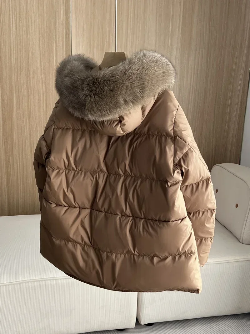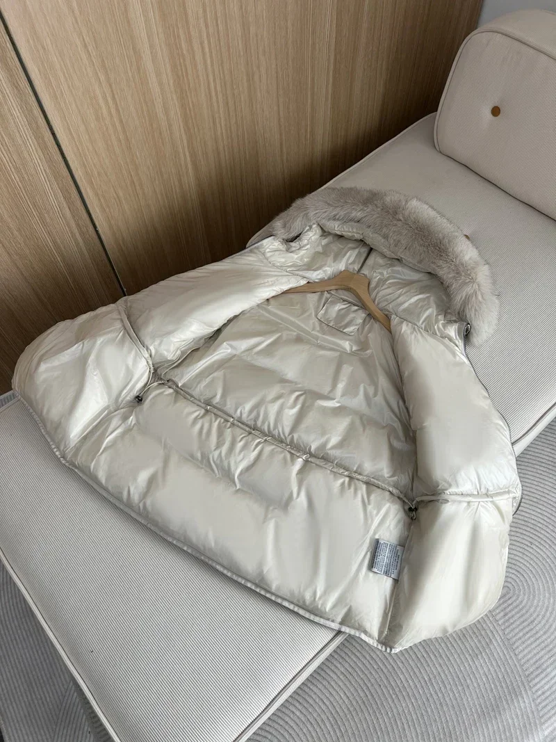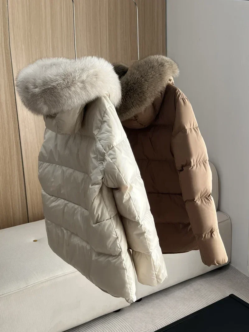 2024 New Fashion Winter White Duck Down Coat Hooded Real Fur Fox Fur Collar Jacket Cape Puffer Coat Women Slim Short Warm