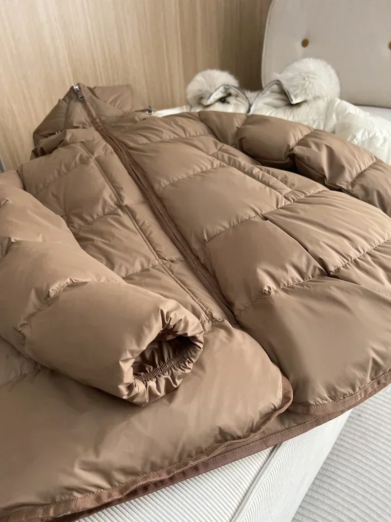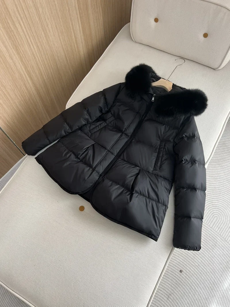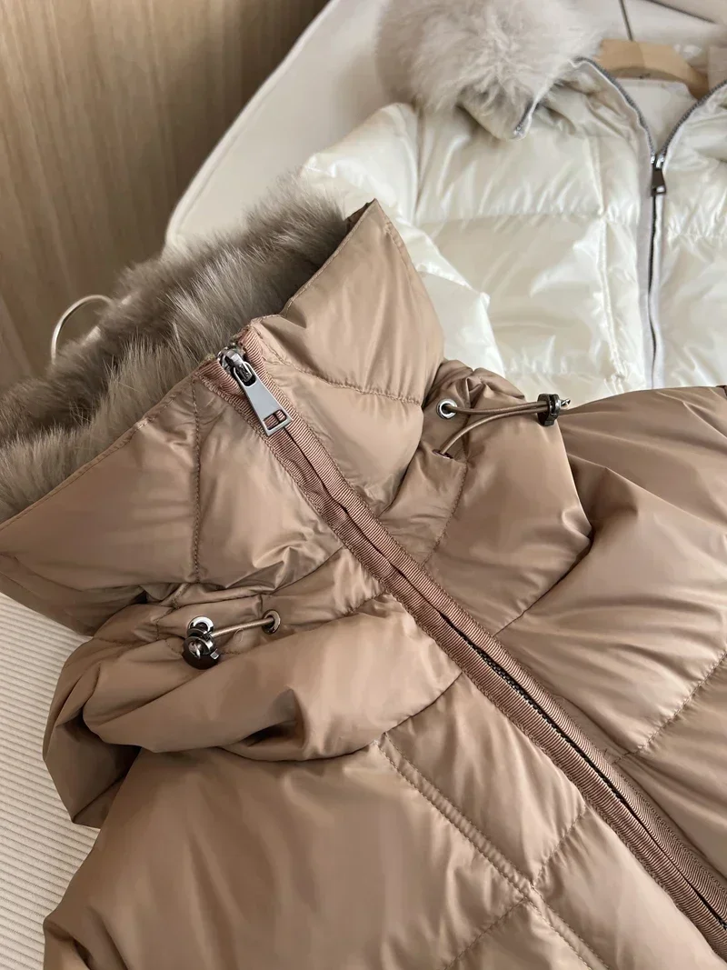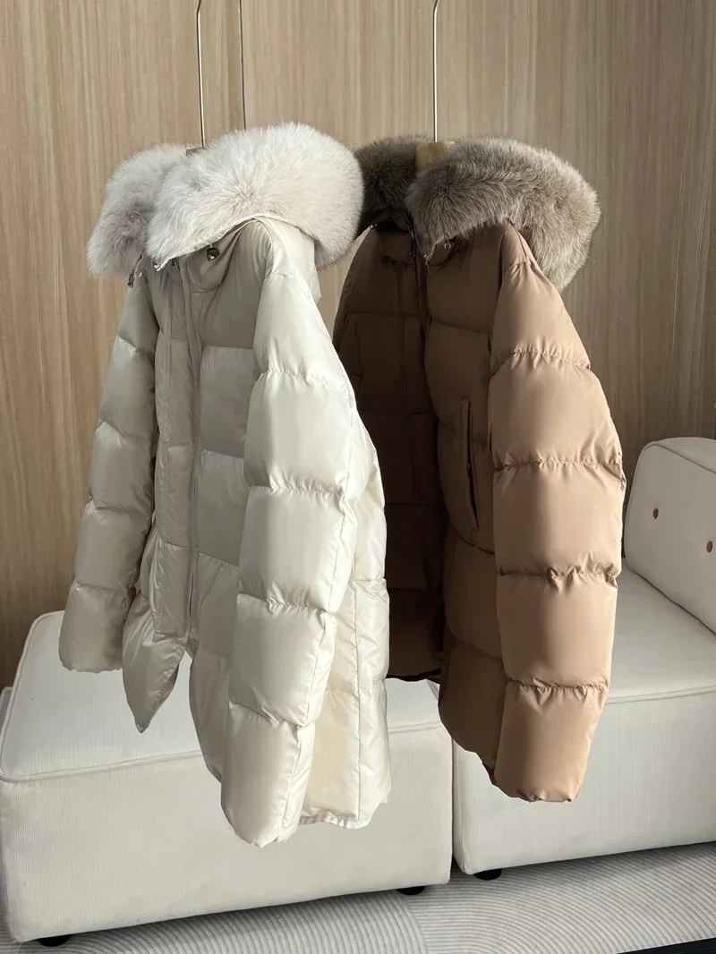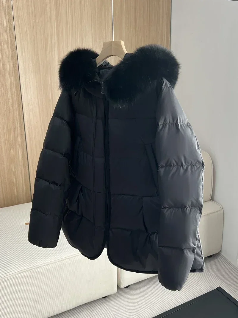 2024 New Fashion Winter White Duck Down Coat Hooded Real Fur Fox Fur Collar Jacket Cape Puffer Coat Women Slim Short Warm