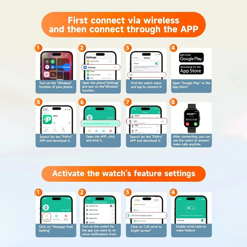 2. After receiving the watch, please charge it first, because after a long time of logistics, the watch will consume electricity. Before use, please scan the QR code in the manual to download the app, and use the app to connect the watch.