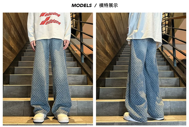 2024 NEW Jeans men Jacquard Pattern Denim Pants Male Straight Fitting Baggy Bottoms Distressed Wide Jeans For Men