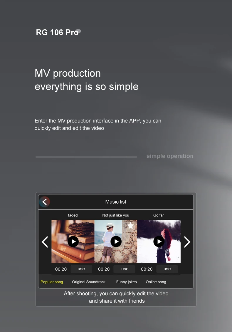 6、MV function: filters, video effects, add background music, picture/video sharing.