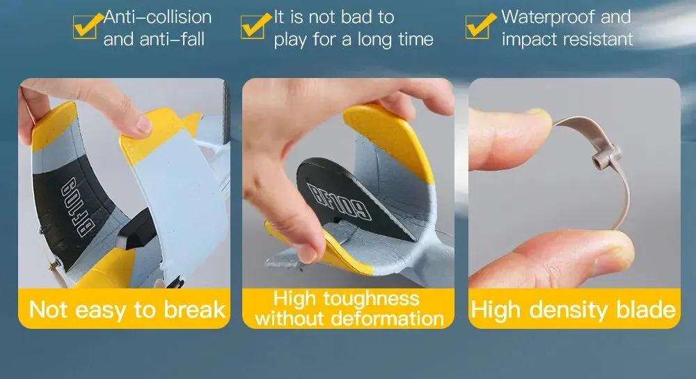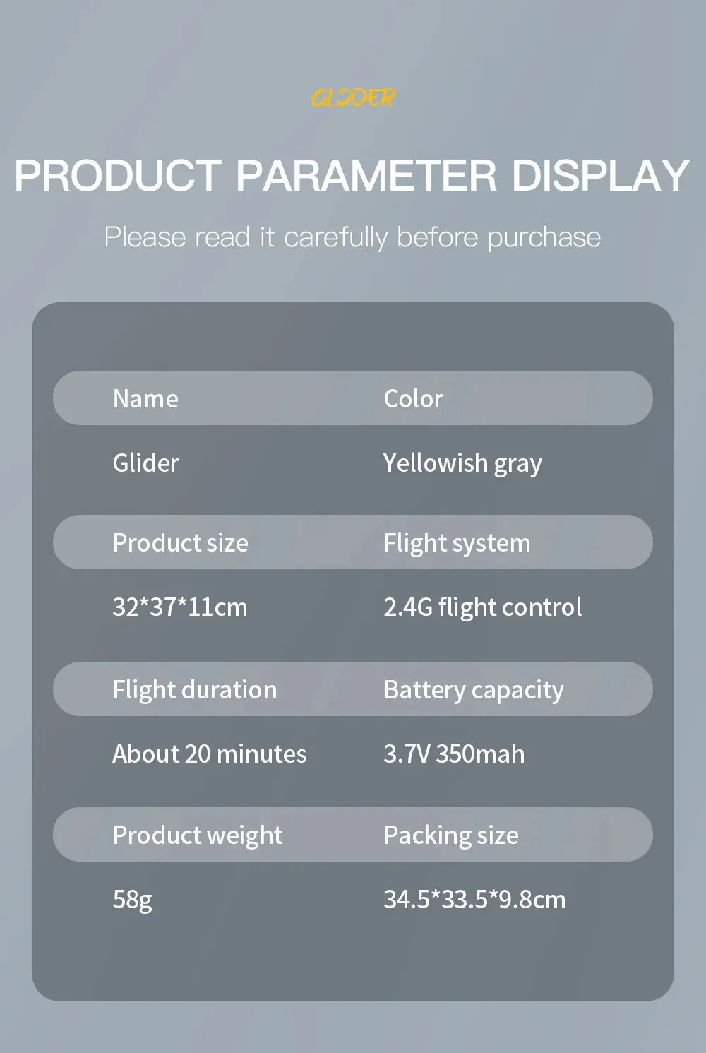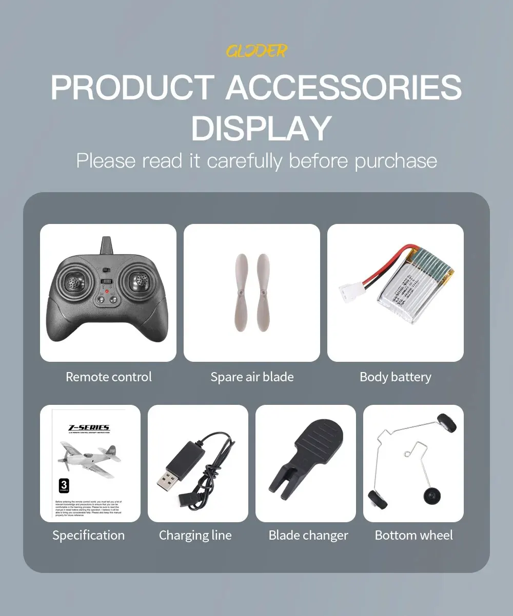 • 2.4G 3CH EPP Foam Remote Control Fighter Fixed Wingspan Glider :This RC plane is designed with a fixed wingspan, making it easy to control and maneuver. The 2.4G 3CH EPP foam material ensures durability and longevity.