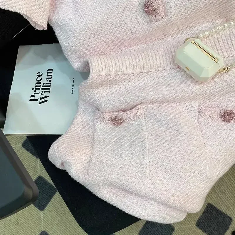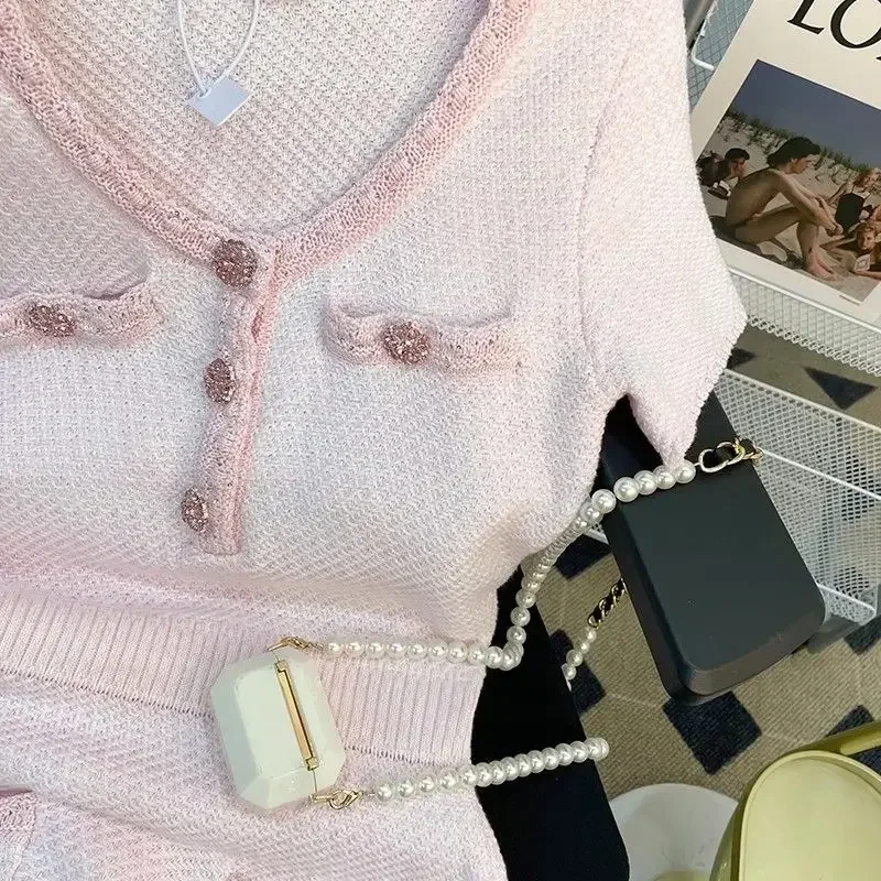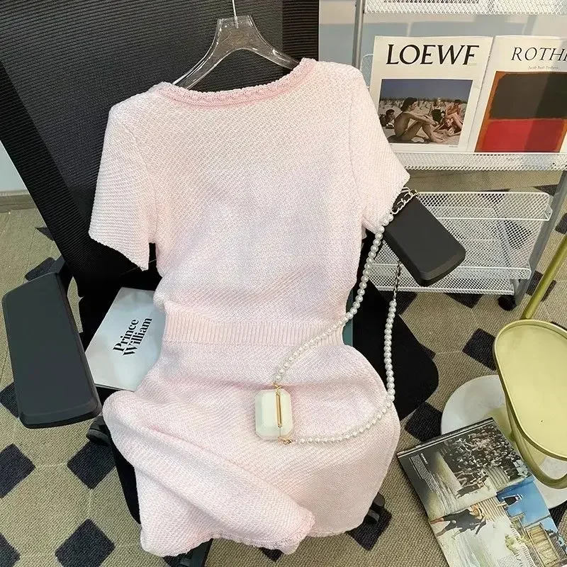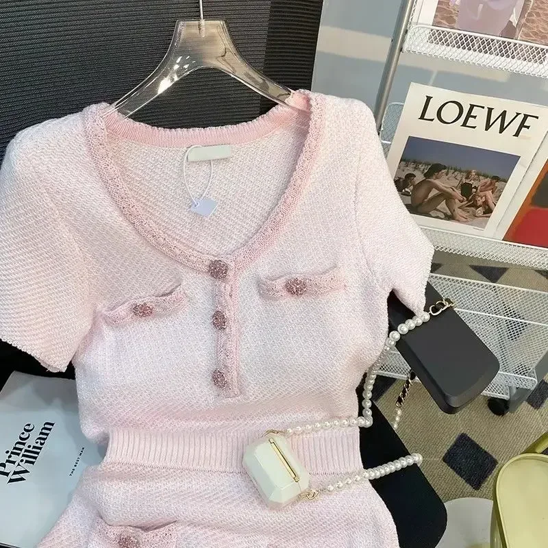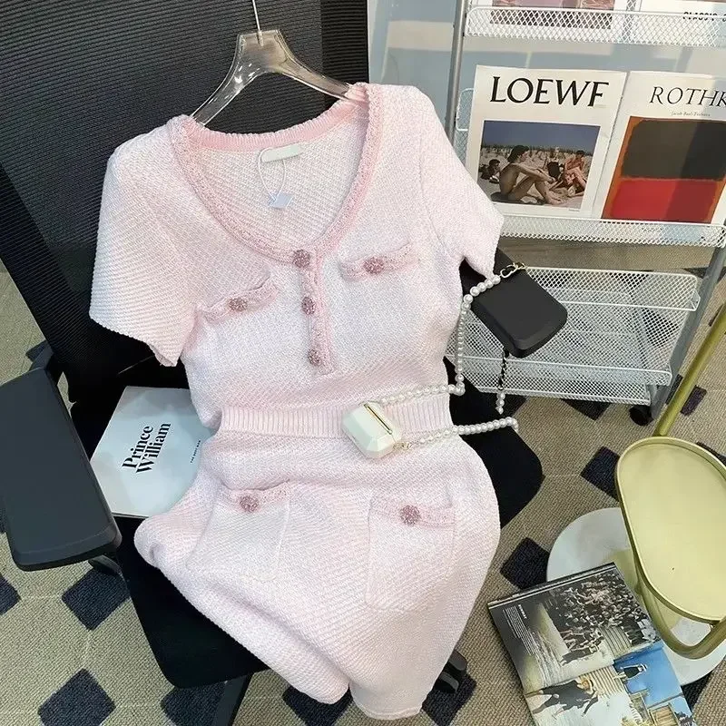 2024 Pink Temperament Knitted Short Skirt Women’s High-end Sense Solid Color Slim-fitting V-neck Waist Dress Summer New