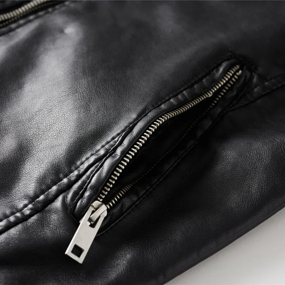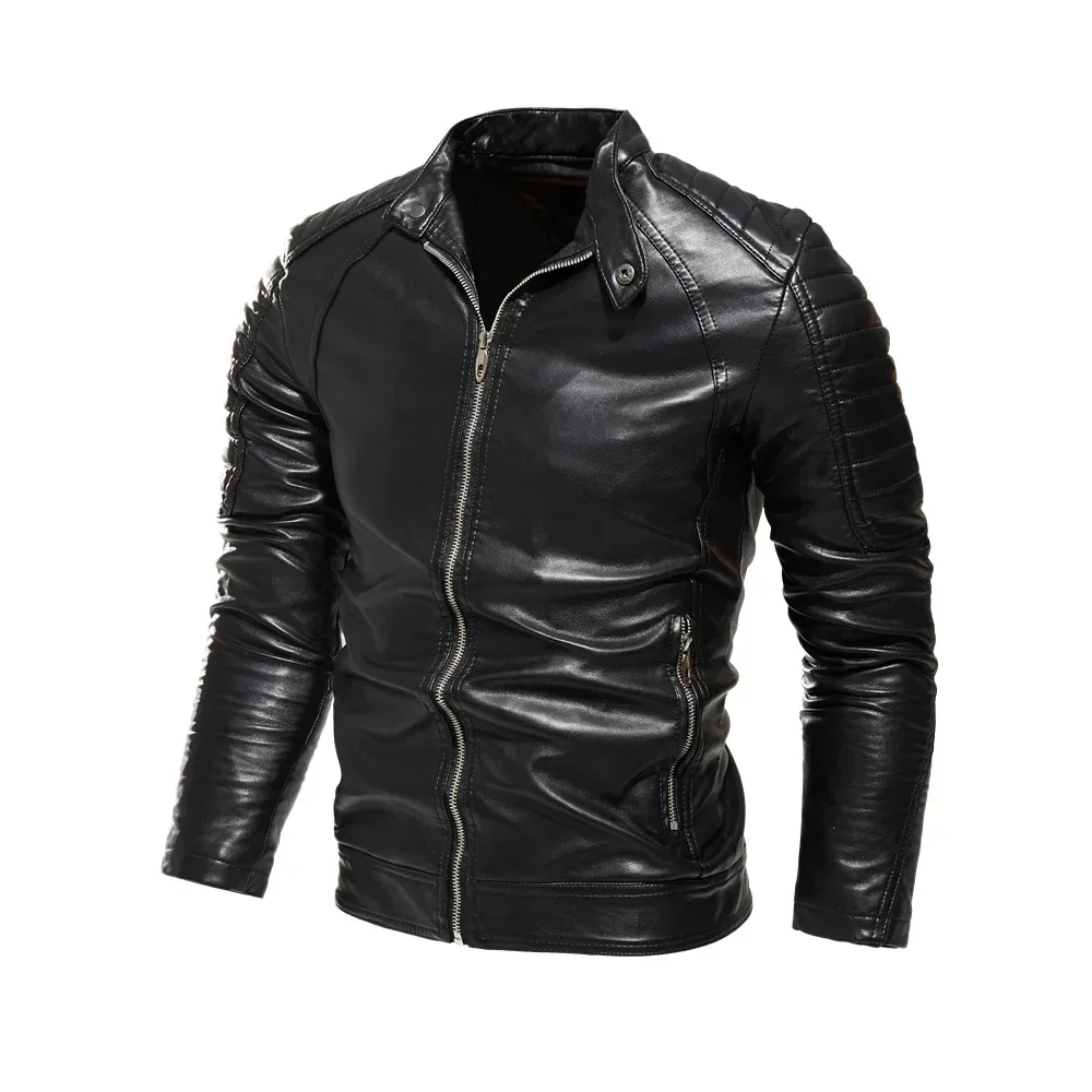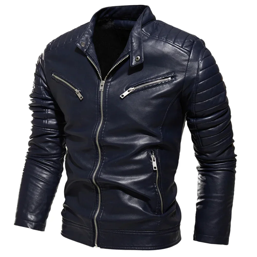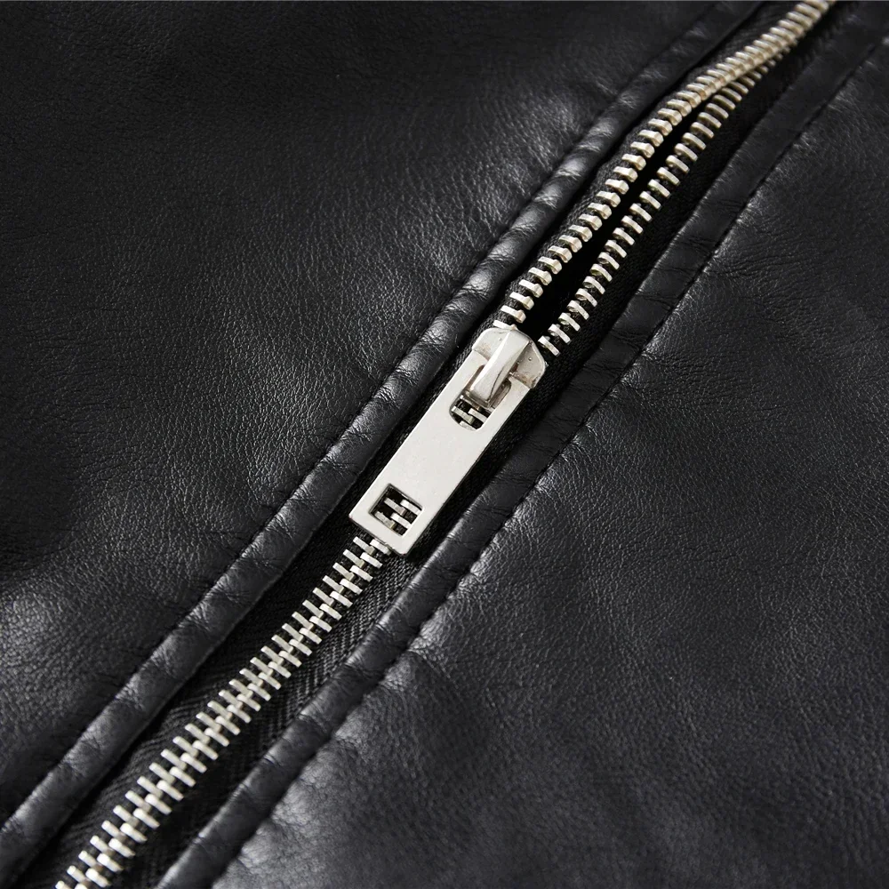 2024 Winter Black Leather Jacket Men Fur Lined Warm Motorcycle Jacket Slim Street Fashion BLack Biker Coat Pleated Design Zipper