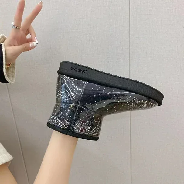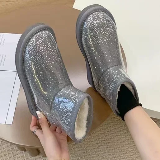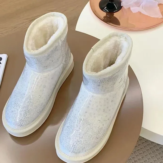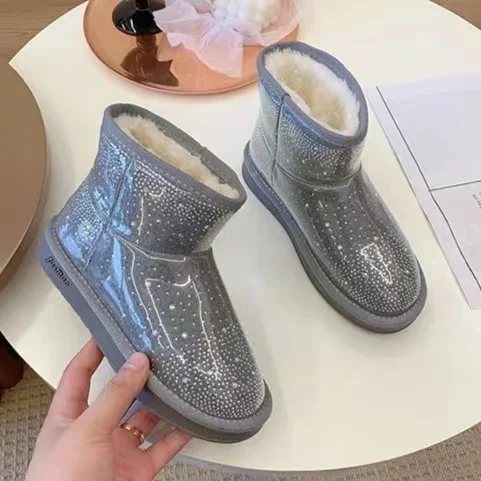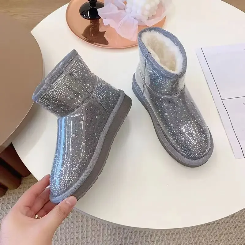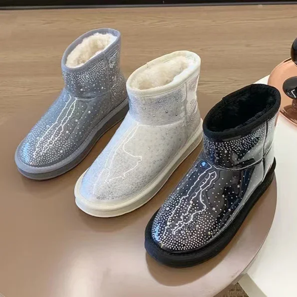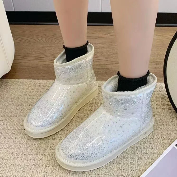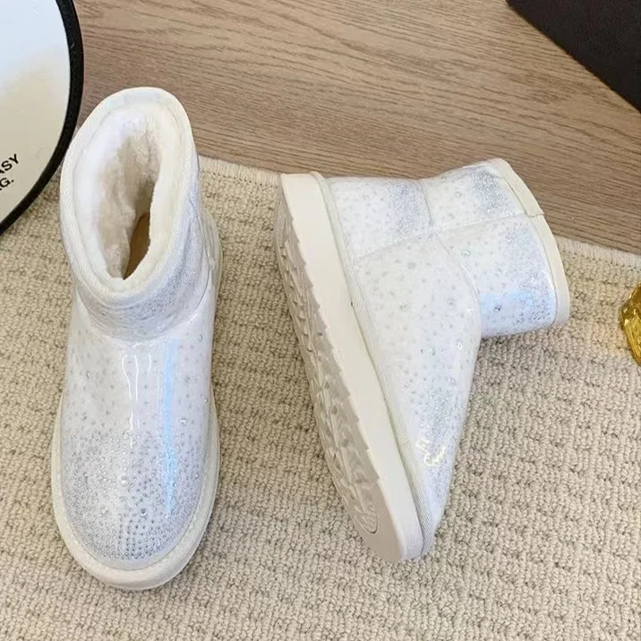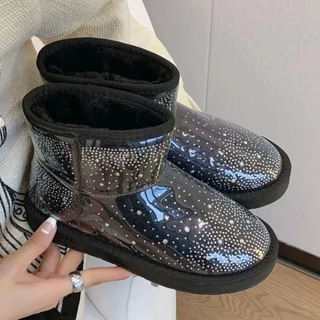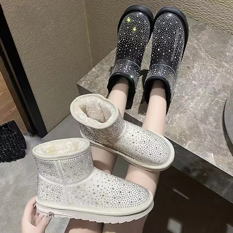2024 Winter New Warm Diamond Snow Boots Woman Flat Shoes Waterproof Plush Warm Shining Crystal Soft Sole Women’s Boots