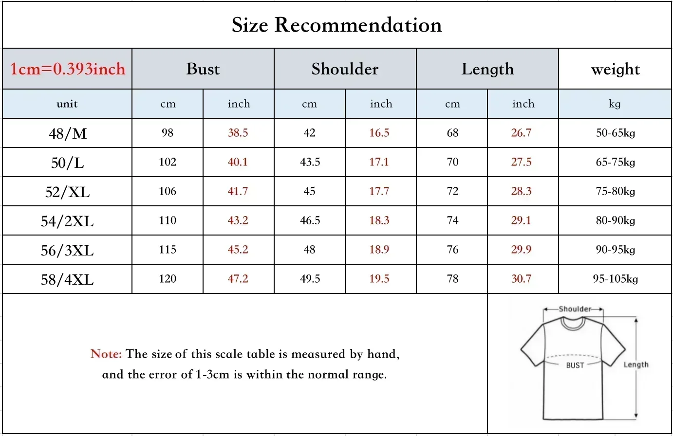 Chinese size 4XL: Length: 78cm, Bust: 120cm, Shoulder: 49.5cm
